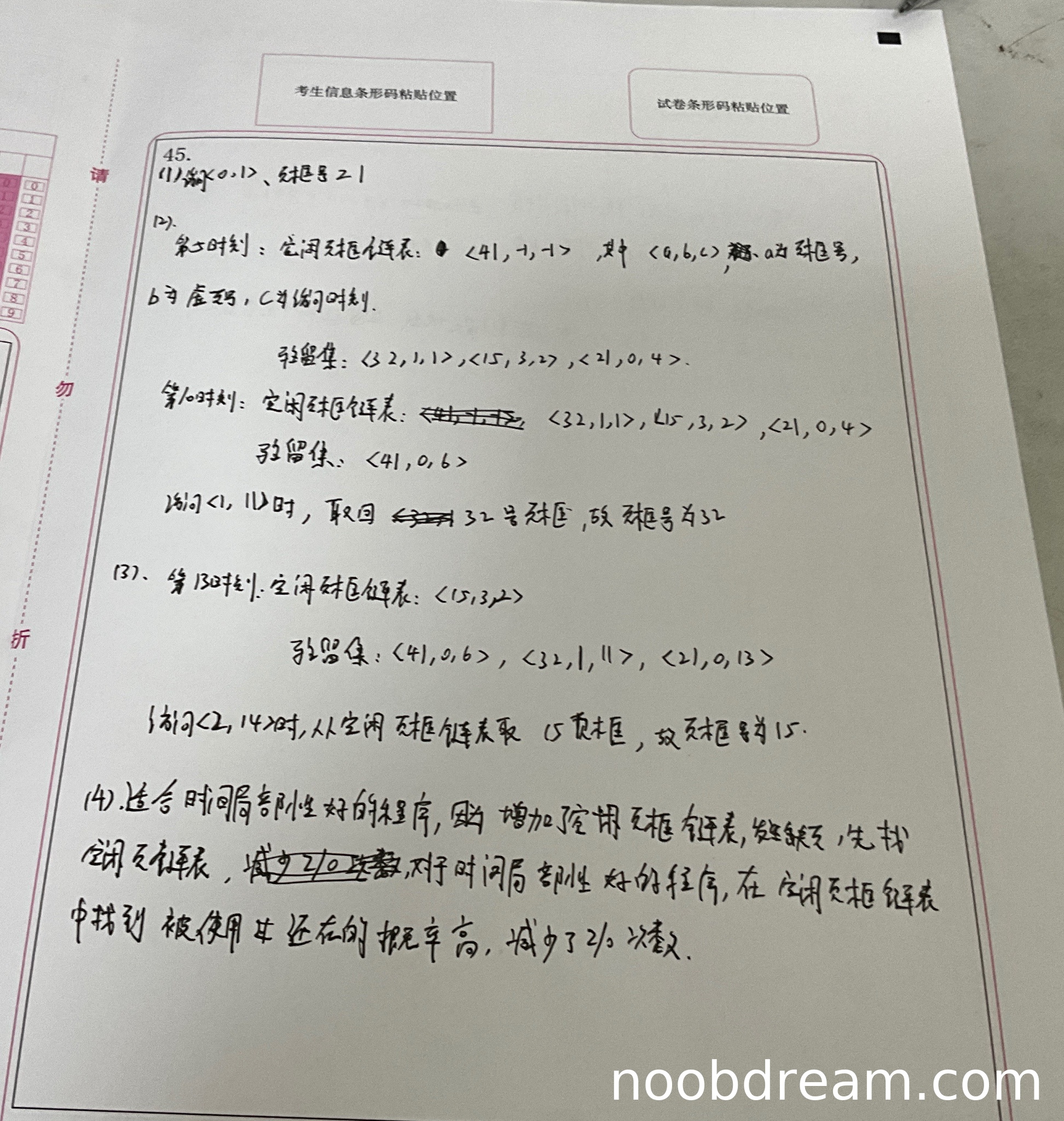 学生第一次识别结果未给出(1)的答案,第二次识别结果中给出"初始<0,1>,页框号21",但题目问的是访问<0,4>时的页框号。根据标准答案,访问<0,4>时页框号应为21。虽然学生没有直接回答(1),但在第二次识别结果的驻留集描述中包含了<21,0,4>,表明访问<0,4>时页框号为21。考虑到识别可能遗漏,且上下文有正确信息,给1分。