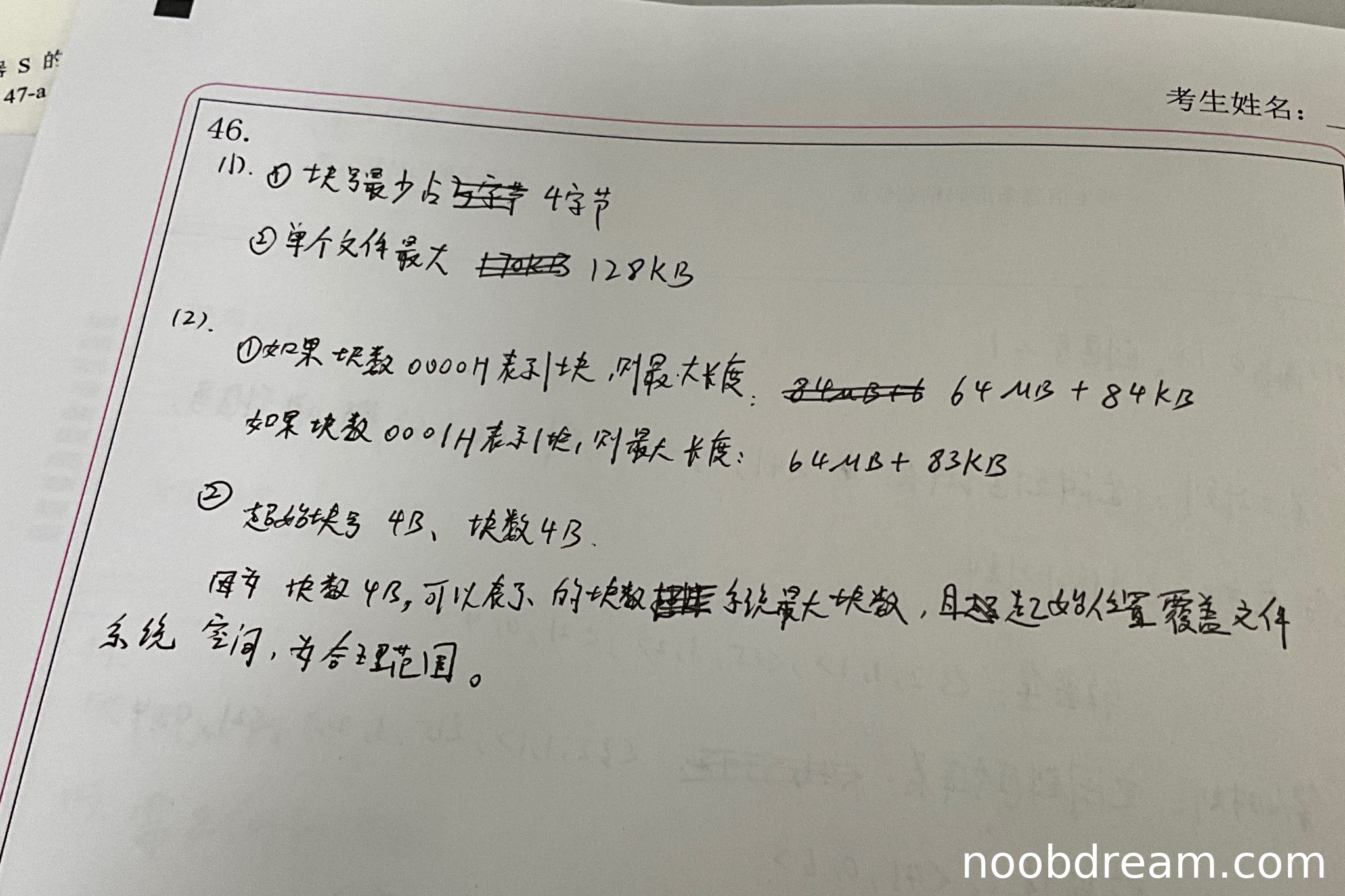 学生答案中关于最大长度的计算存在部分错误:标准答案是65620KB(即64MB+84KB),而学生给出了两种不同解释(64MB+84KB和64MB+83KB),其中64MB+84KB是正确的,但另一种解释错误。考虑到学生可能对块数表示方式存在误解,但正确结果已给出,扣1分。