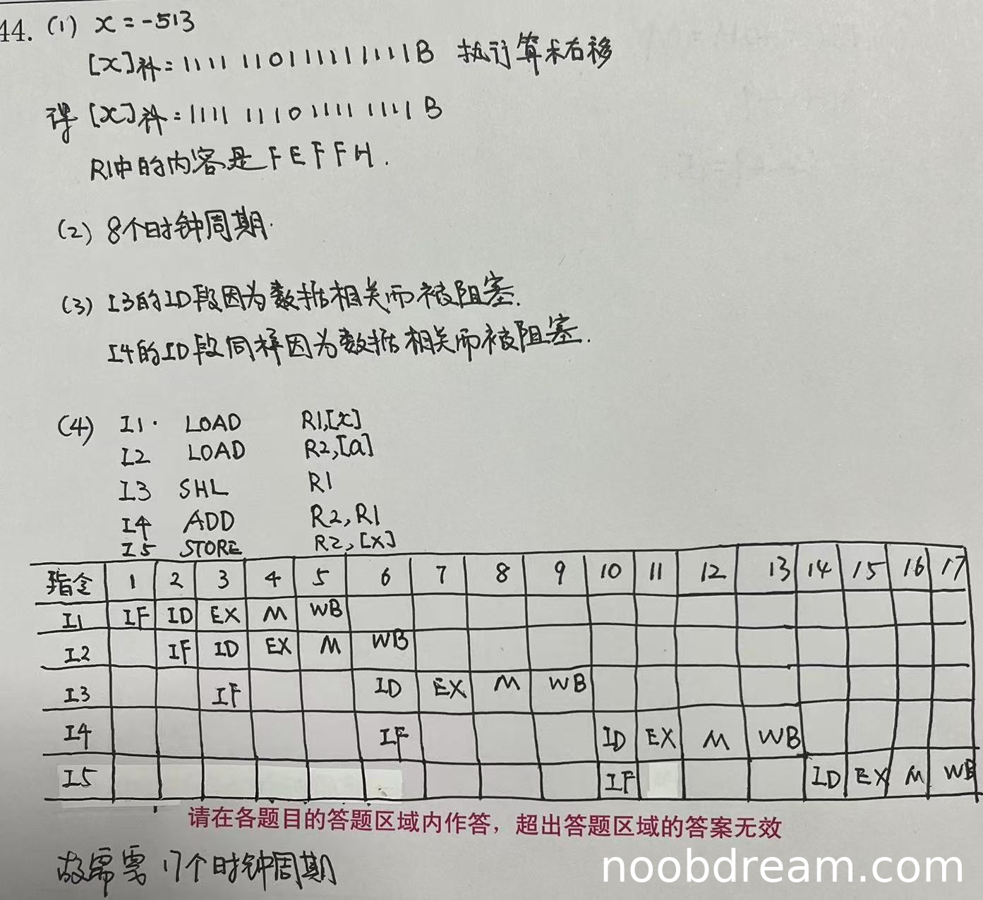 学生答案的指令序列正确:I1 LOAD R1,[x];I2 LOAD R2,[a];I3 SHL R1;I4 ADD R2,R1;I5 STORE R2,[x]。与标准答案一致,得2分(指令部分满分2分)。流水线执行过程表格基本正确,但第二次识别中I5的ID段误写为"LD",应为"ID",根据禁止扣分规则第1条(相似字符误写不扣分),判断为识别错误,不扣分。表格整体时序正确,得3分(表格部分满分3分)。最终得出17个时钟周期,正确,得2分(周期数部分满分2分)。本小题总得7分。