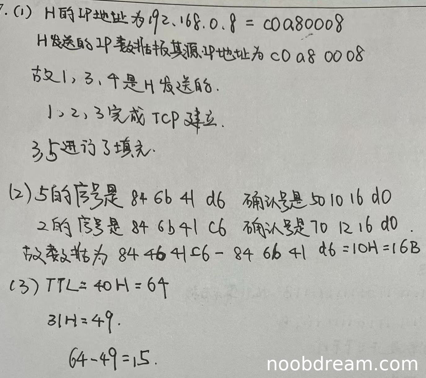学生正确识别出S发出的IP分组的TTL=40H=64,5号分组的TTL=31H=49,并通过TTL差值计算经过的路由器数量(64-49=15),结果正确。本小题得2分。