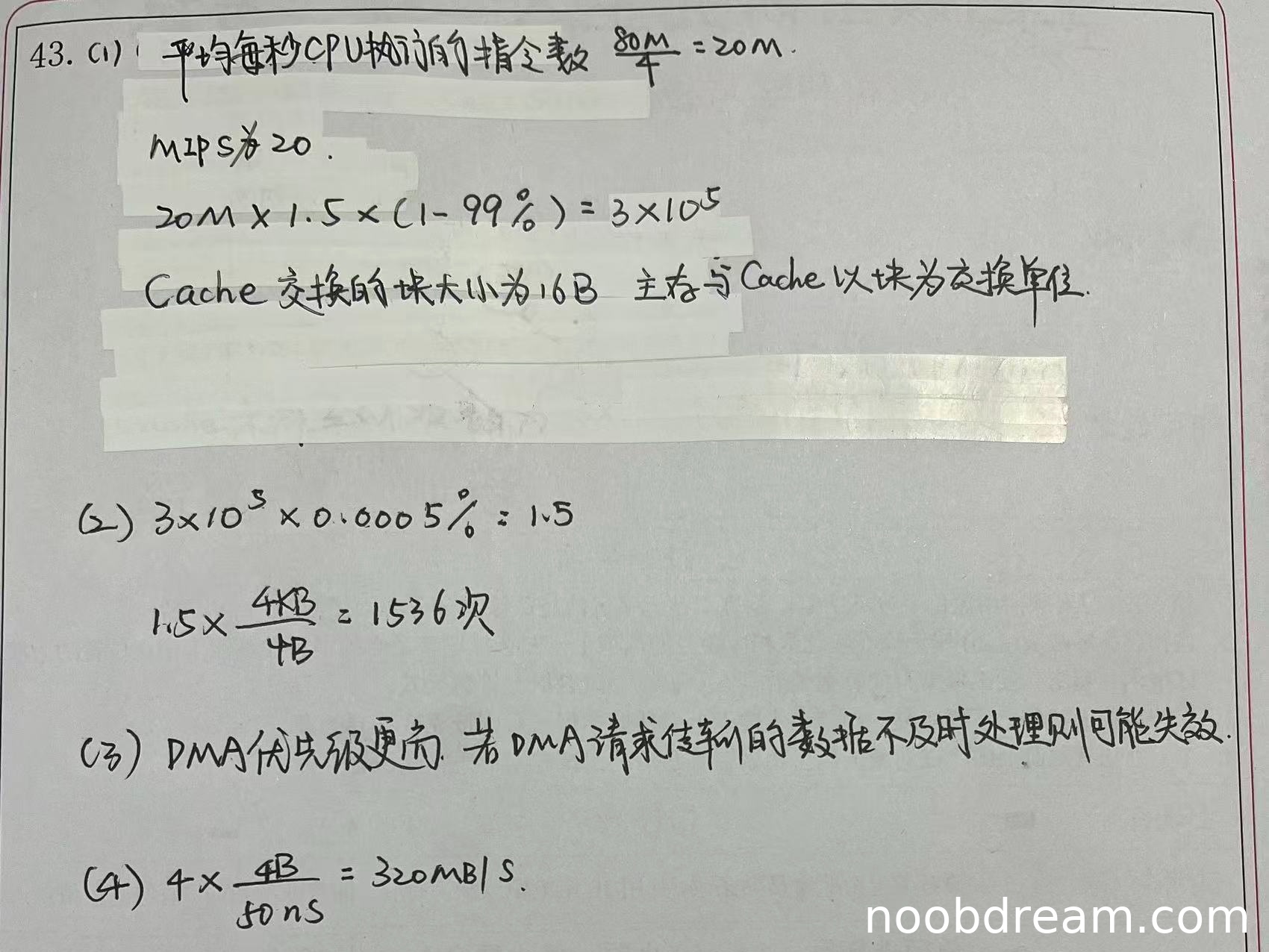 学生正确计算了MIPS数为20(1分),正确计算了平均每秒Cache缺失次数为300k(1分),但在计算主存带宽时,学生仅提到“主存与Cache以块为交换单位”,未给出具体数值计算过程,因此扣1分。最终得分为3分。