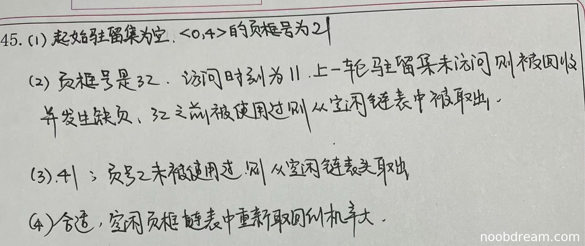 理由部分:学生答案提到"访问时刻为11,上一轮驻留集未访问则被回收,并发生缺页,32之前被使用过则从空闲链表中被取出",正确描述了页框回收和重新取回的过程,但未明确说明扫描轮次(如第二轮扫描回收页框32)和页框32在空闲链表中的位置。理由基本正确但不够完整,扣0.5分。本小题得1.5分。