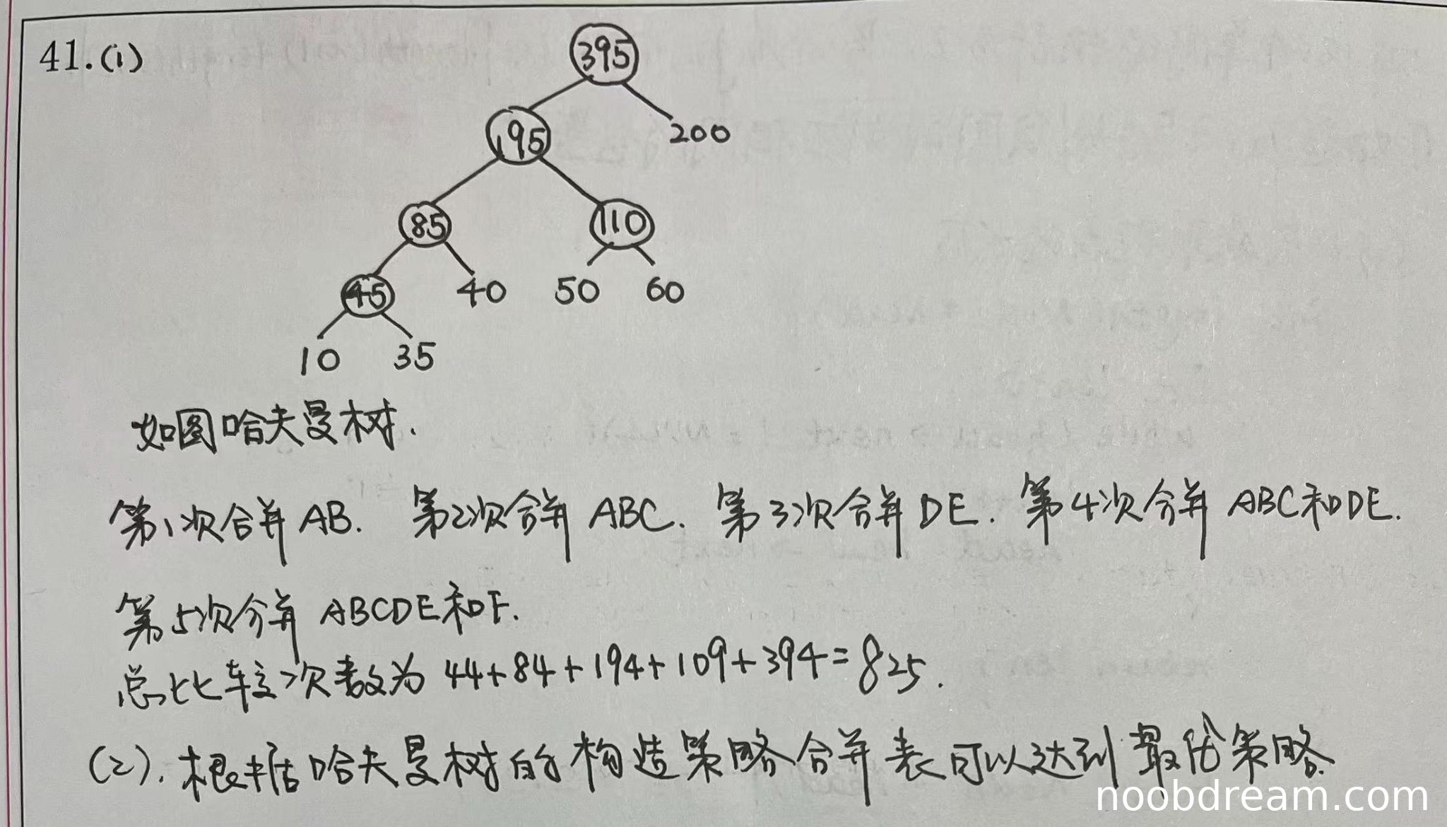 学生给出了完整的合并过程:第一次合并A和B(长度10和35),第二次合并AB和C(长度45和40),第三次合并D和E(长度50和60),第四次合并ABC和DE(长度85和110),第五次合并ABCDE和F(长度195和200)。这一过程与标准答案中的哈夫曼树(最佳归并树)合并策略完全一致,合并顺序正确。