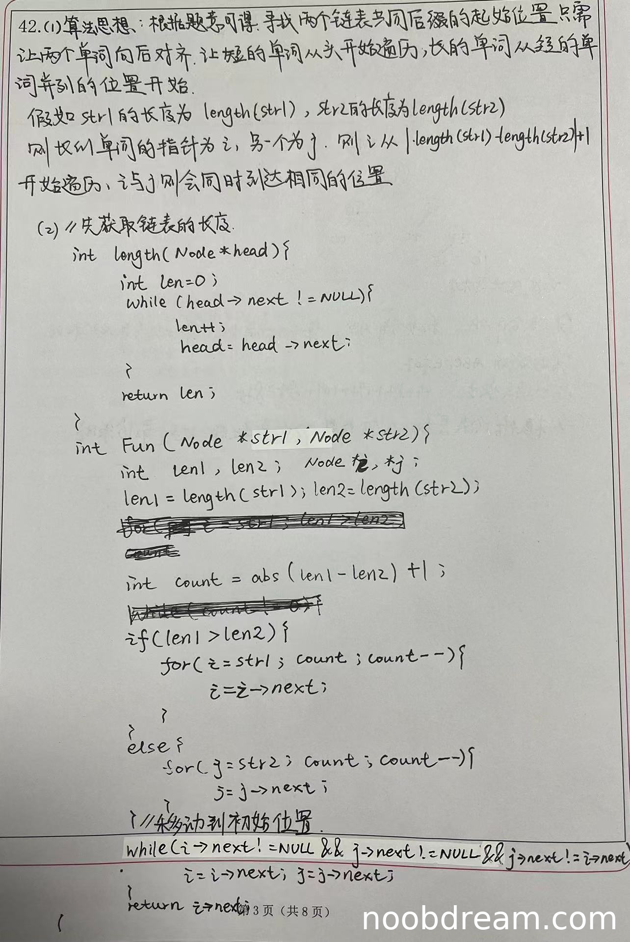 理由:学生的算法思想基本正确,提出了通过计算链表长度差来对齐指针的方法,与标准答案思路一致。但在描述中存在不严谨之处:①"短的单词从头开始遍历"表述不准确,实际上两个指针都应该从对齐后的位置开始同步移动;②"i从|length(str1)-length(str2)|+1开始遍历"中的"+1"应该是让长链表指针跳过长度差个结点,但表述不够清晰。扣1分。