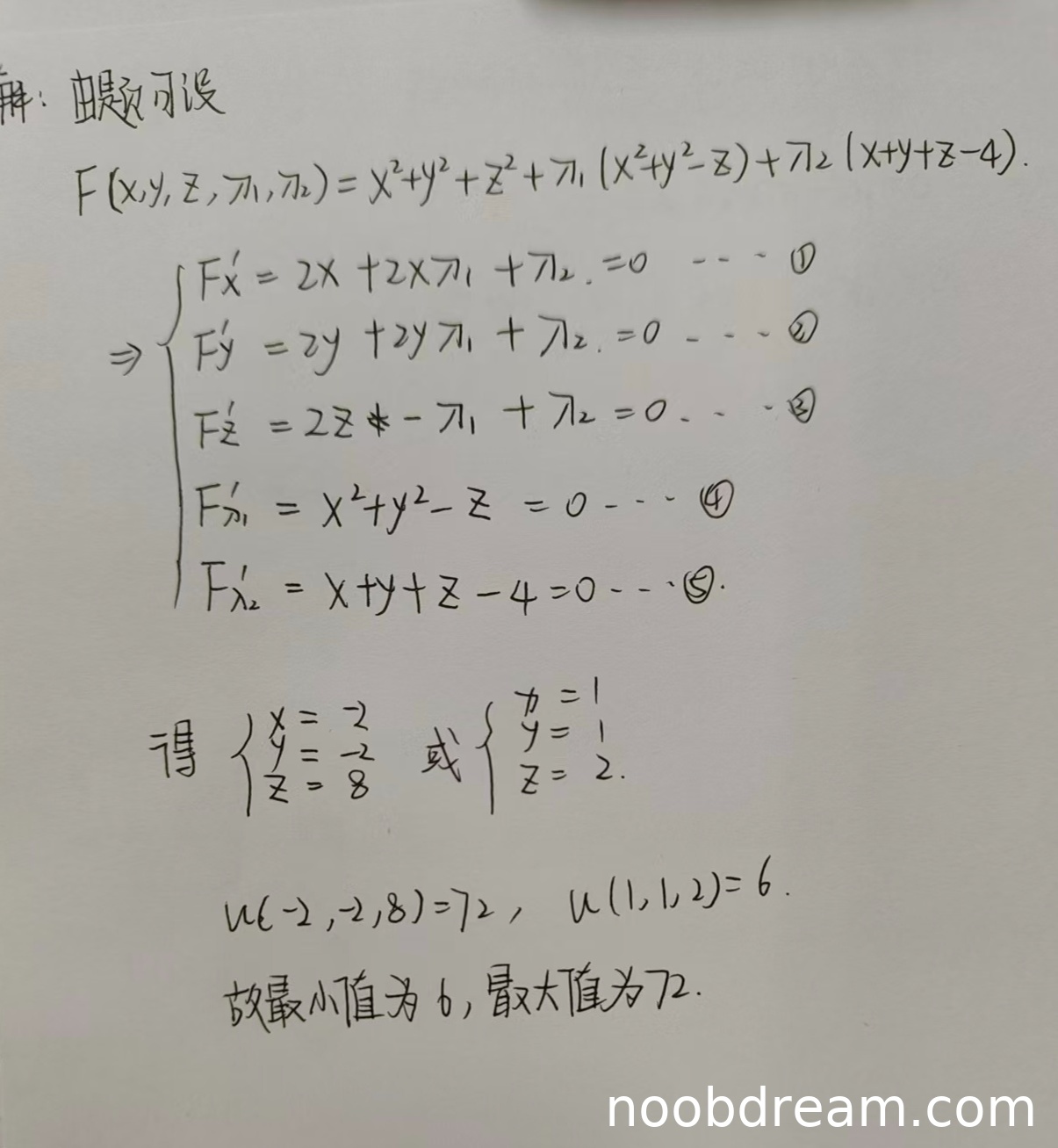 学生正确构建了拉格朗日函数,并列出所有偏导方程。方程组推导过程完整,解得两组驻点坐标正确,代入目标函数计算极值正确。最终得出最小值6和最大值72的结论正确。整个过程逻辑严密,与标准答案完全一致。