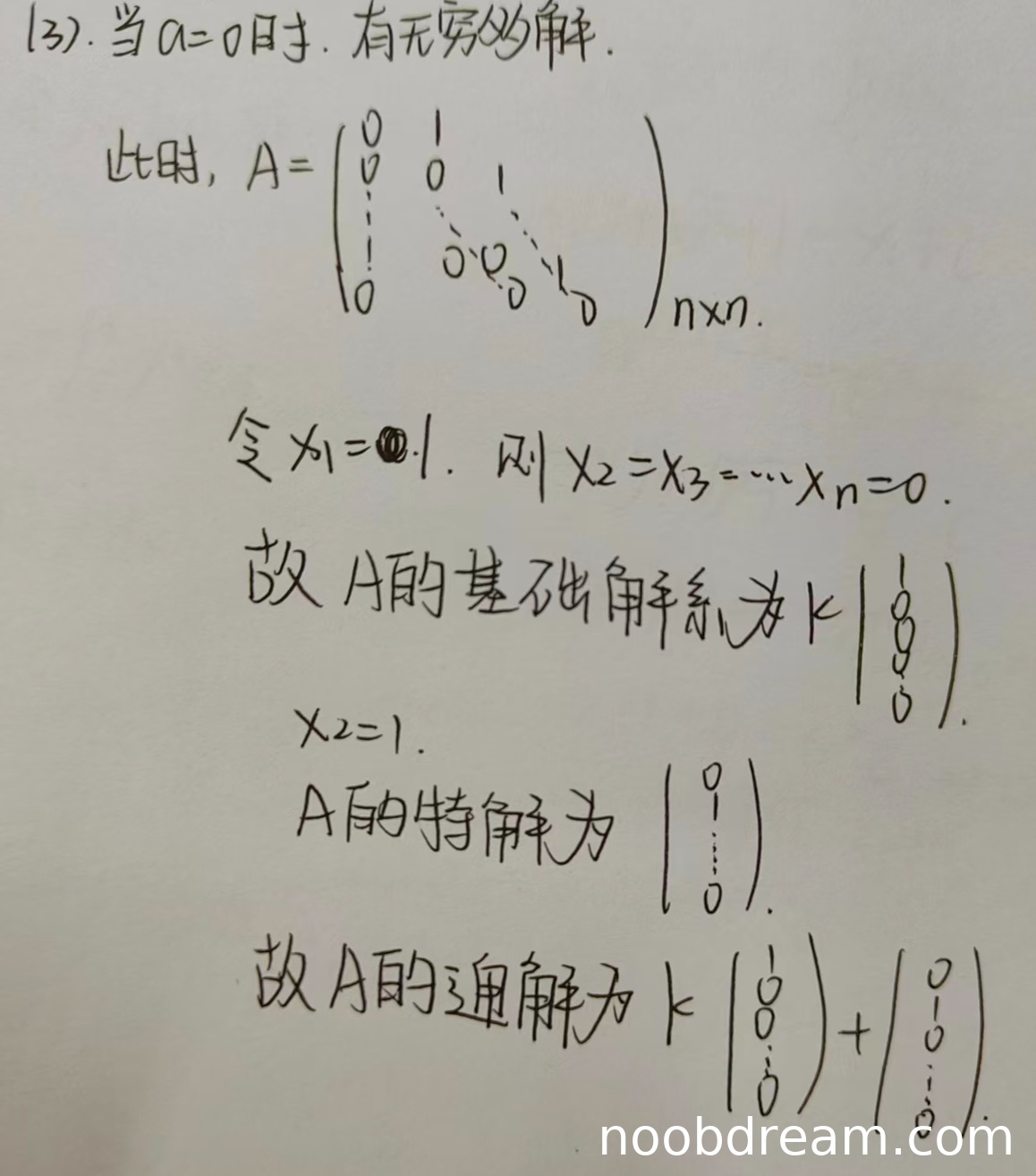 学生正确指出a=0时有无穷多解。给出的基础解系ξ=(1,0,...,0)ᵀ和特解η=(0,1,0,...,0)ᵀ都是正确的,通解形式x=kξ+η也正确。虽然矩阵A在a=0时的具体形式写的不够完整(缺少最后一行全零),但核心逻辑正确,不影响得分。得满分。