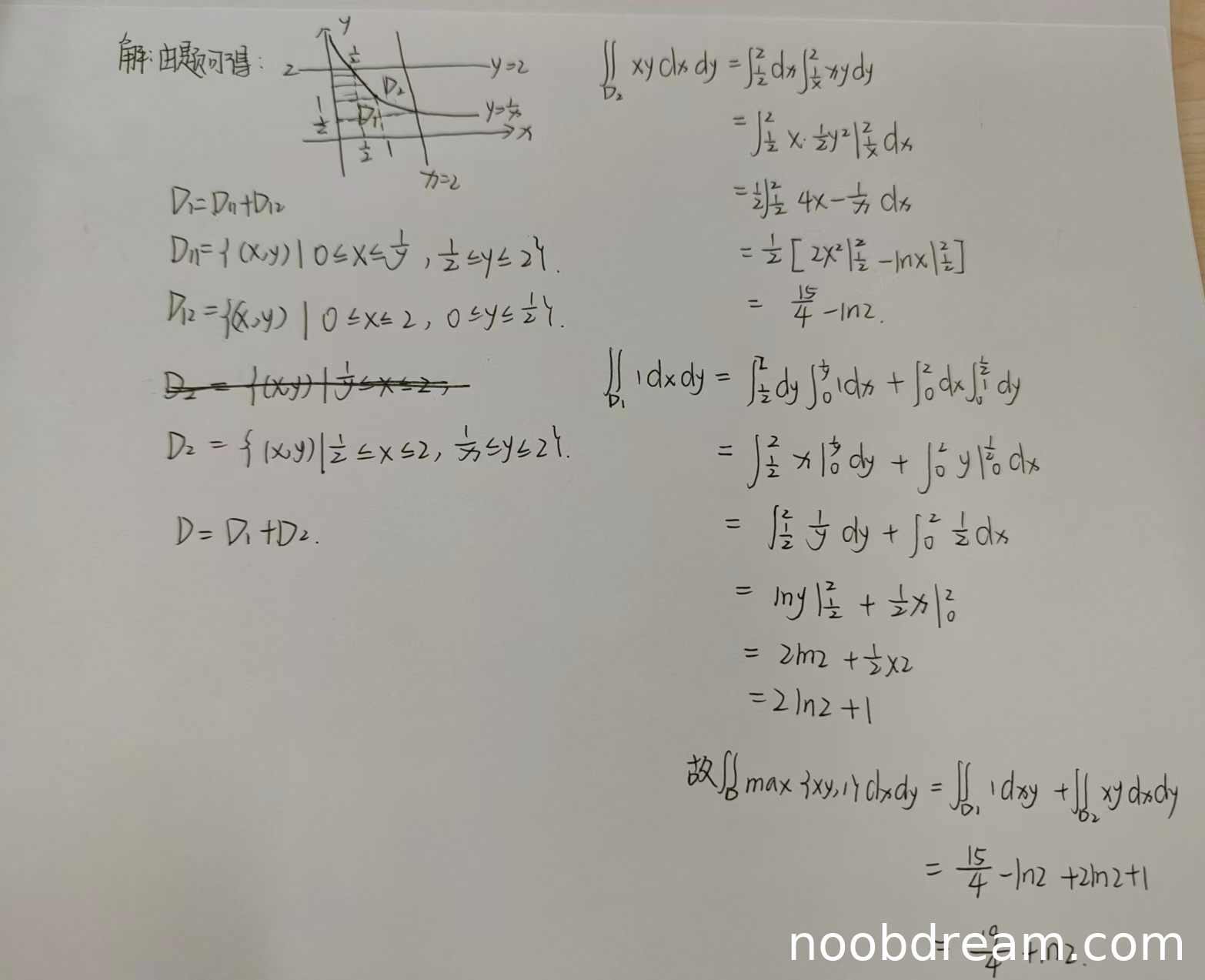 理由:学生正确地将区域D划分为D₁和D₂,其中D₁对应max{xy,1}=1的区域,D₂对应max{xy,1}=xy的区域。但在D₁的划分中,第一次识别结果将D₁分为D₁₁和D₁₂,其中D₁₁的定义域"0≤x≤1/y, 1/2≤y≤2"和D₁₂的定义域"0≤x≤2, 0≤y≤1/2"存在重叠区域,且D₁₁的积分限设置不够合理。第二次识别结果中D₂的定义域"1/y≤x≤2, 1/y≤y≤2"存在明显错误。区域划分存在逻辑错误,扣1分。