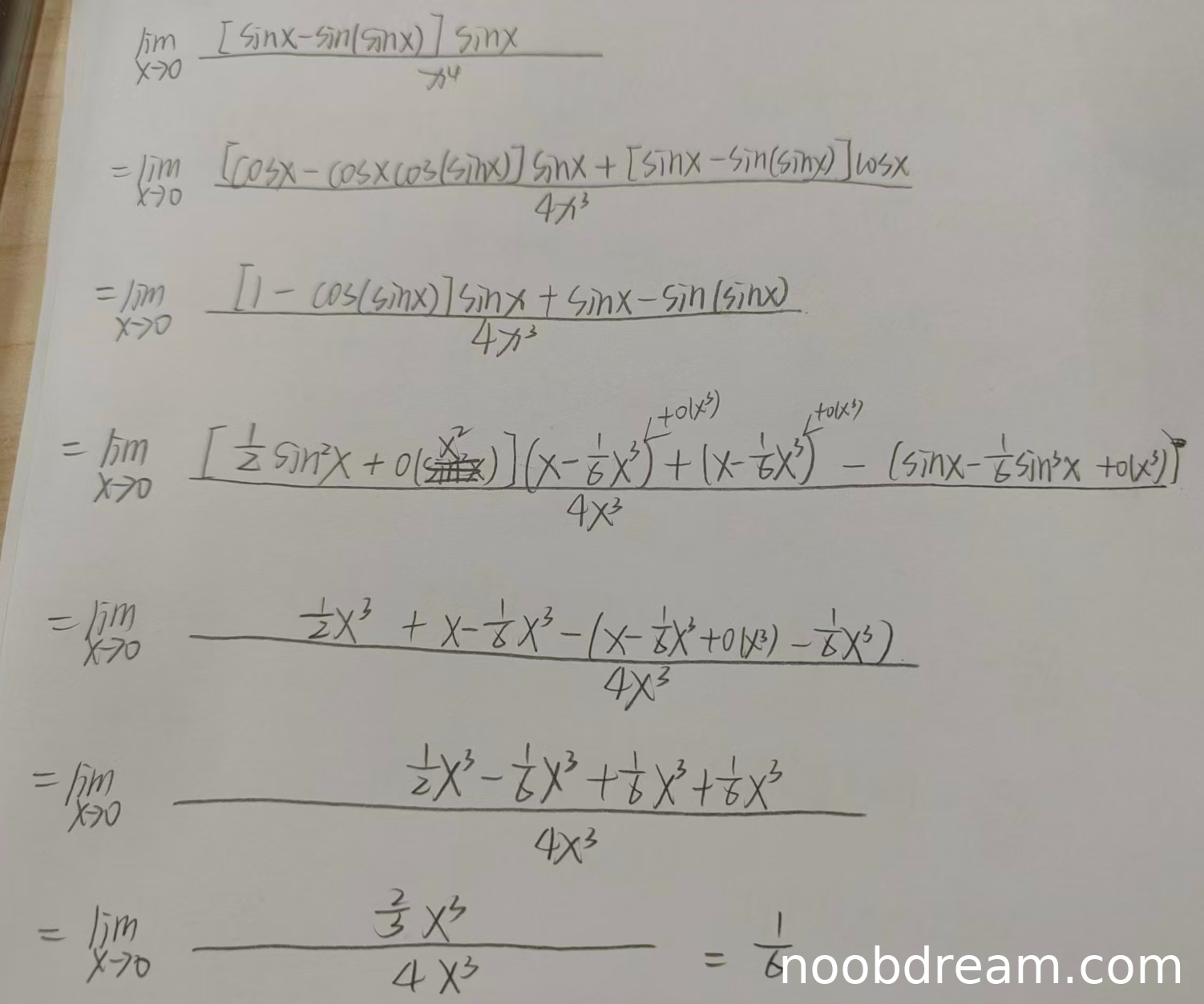 在第一次识别结果的第3步中,表达式写为"o(frac{x^2}{sin x})"存在错误,应为"o(x^2)",但后续计算中实际使用了正确的展开式,这可能是识别错误或笔误。