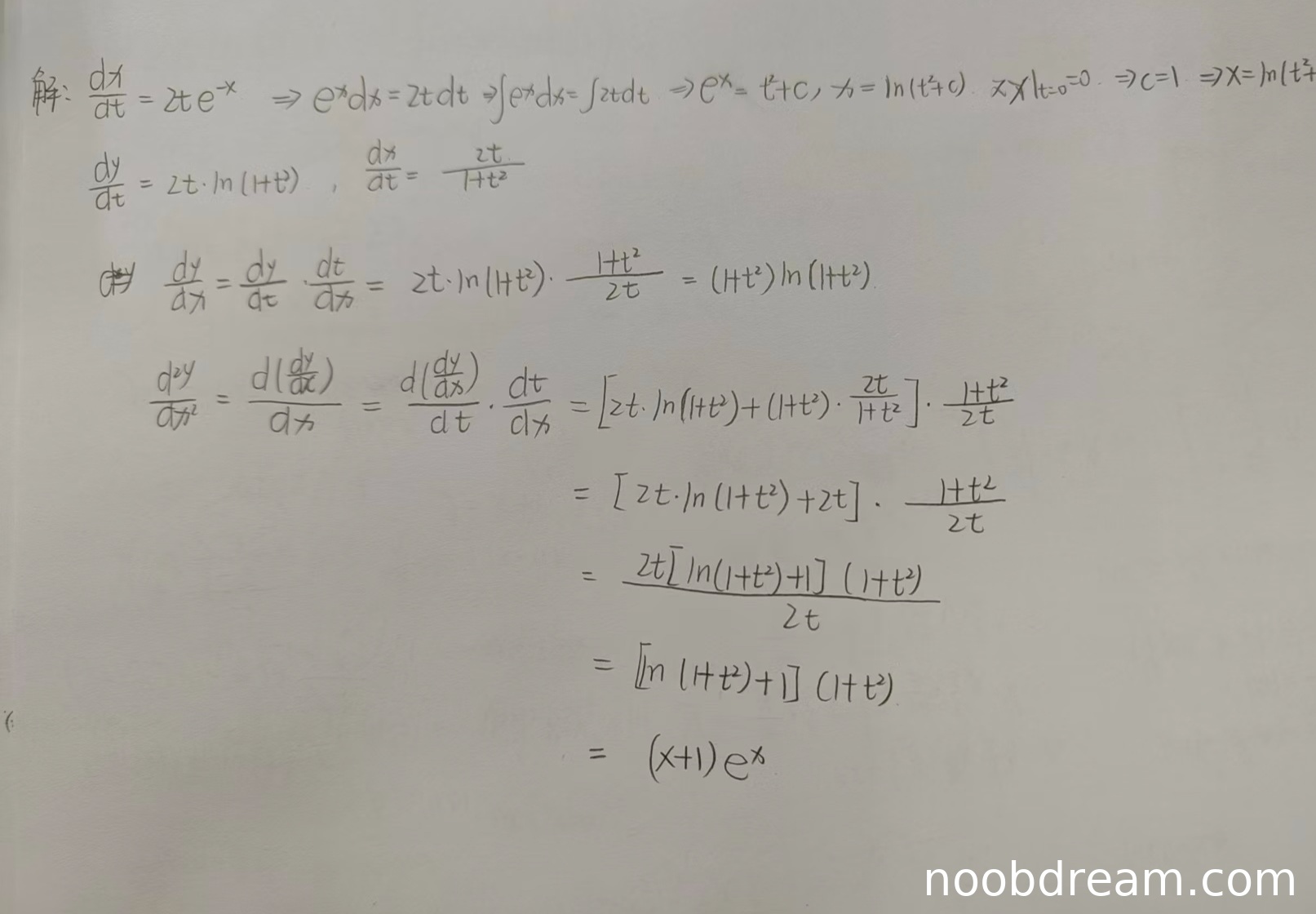 第二次识别:虽然微分方程解错了(得到 \(x = \ln(t+1)\)),但在计算 \(\frac{dy}{dx}\) 时,使用的 \(\frac{dy}{dt}\) 和 \(\frac{dx}{dt}\) 表达式是基于正确的参数关系(题目给出的 \(y\) 定义和它自己解出的 \(x(t)\)),其推导过程本身无误。不过由于 \(x(t)\) 错误,最终表达式在变量关系上不成立,但此步骤的逻辑和计算过程正确。根据"思路正确不扣分"原则,且主要判断核心逻辑,此处不扣分,得3分。