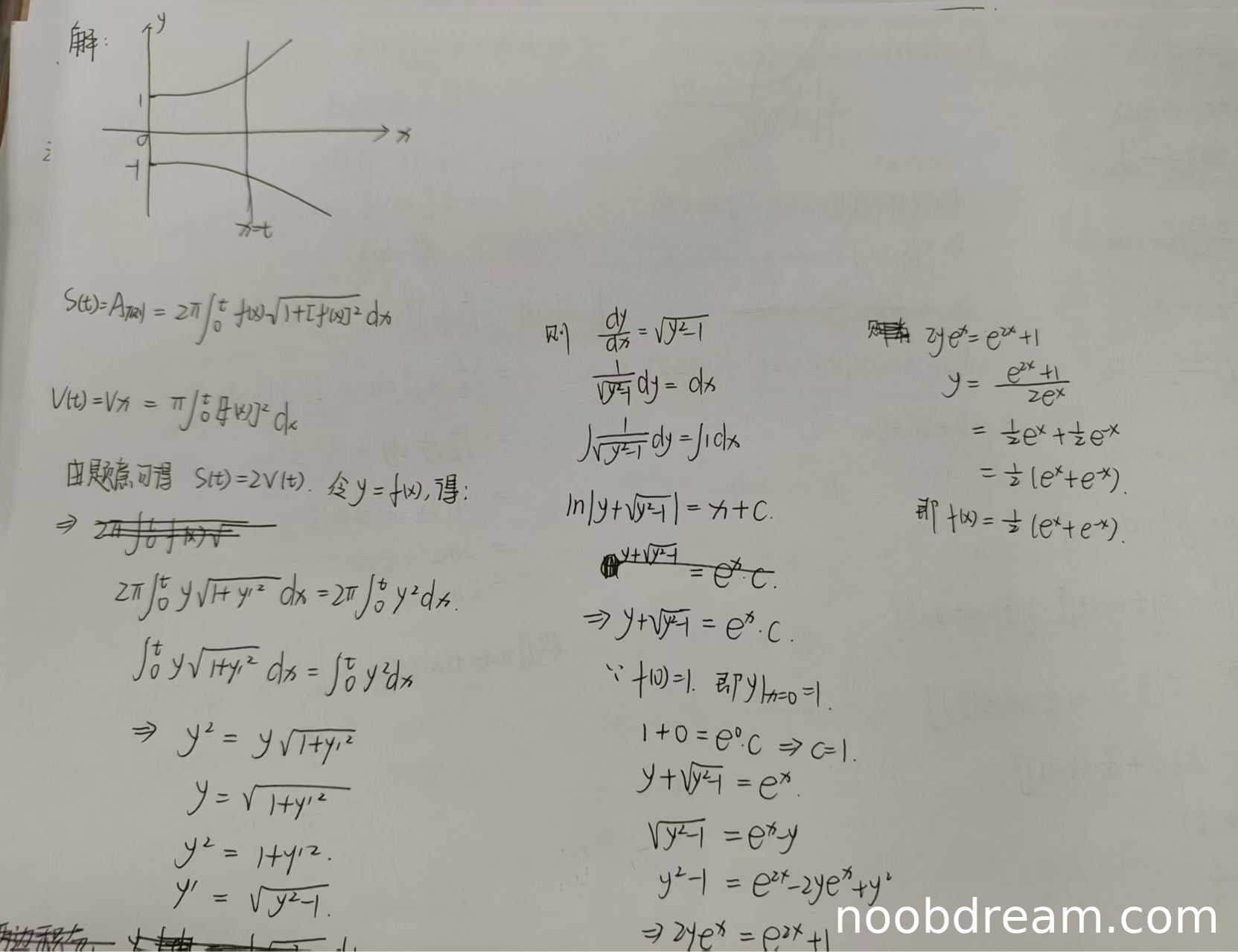 学生作答正确给出了旋转体侧面积和体积的公式,并正确应用了题意条件 S(t) = 2V(t)。通过变上限积分求导得到微分方程,正确分离变量并求解,最终得到正确结果 f(x) = (e^x + e^(-x))/2。虽然第一次识别结果中在积分步骤有轻微书写不规范(如 ln|y+√(y²-1)| = x+C 后写成了 (y+√(y²-1))/ = e^x·C,但根据上下文可判断为识别错误,不影响逻辑),但整体推导正确。第二次识别结果完整且正确。因此给满分10分。