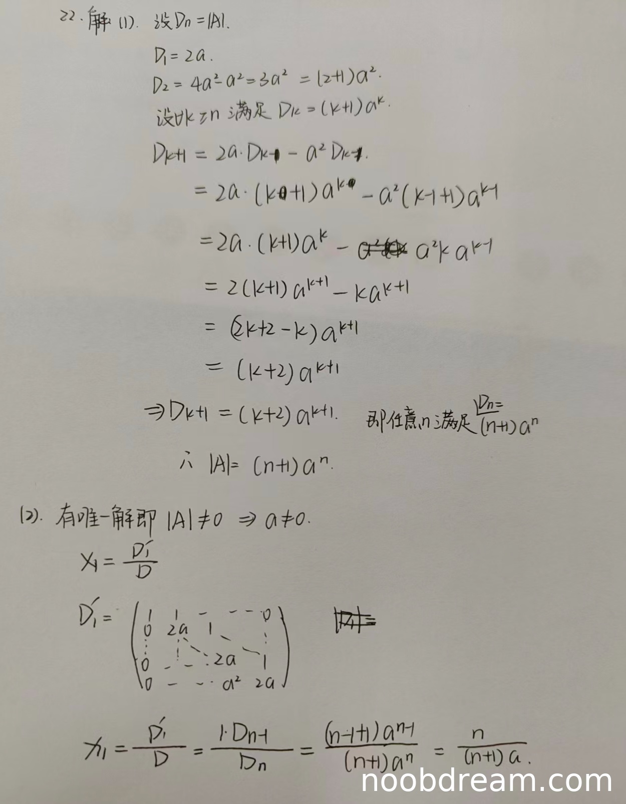 学生正确指出有唯一解的条件是|A|≠0即a≠0。在计算x₁时,两次识别结果略有差异:第一次识别中D₁的行列式写法有误,但计算过程正确;第二次识别中D₁'的写法更规范。最终都得到正确结果x₁=n/[(n+1)a]。思路和结果都正确,得满分。