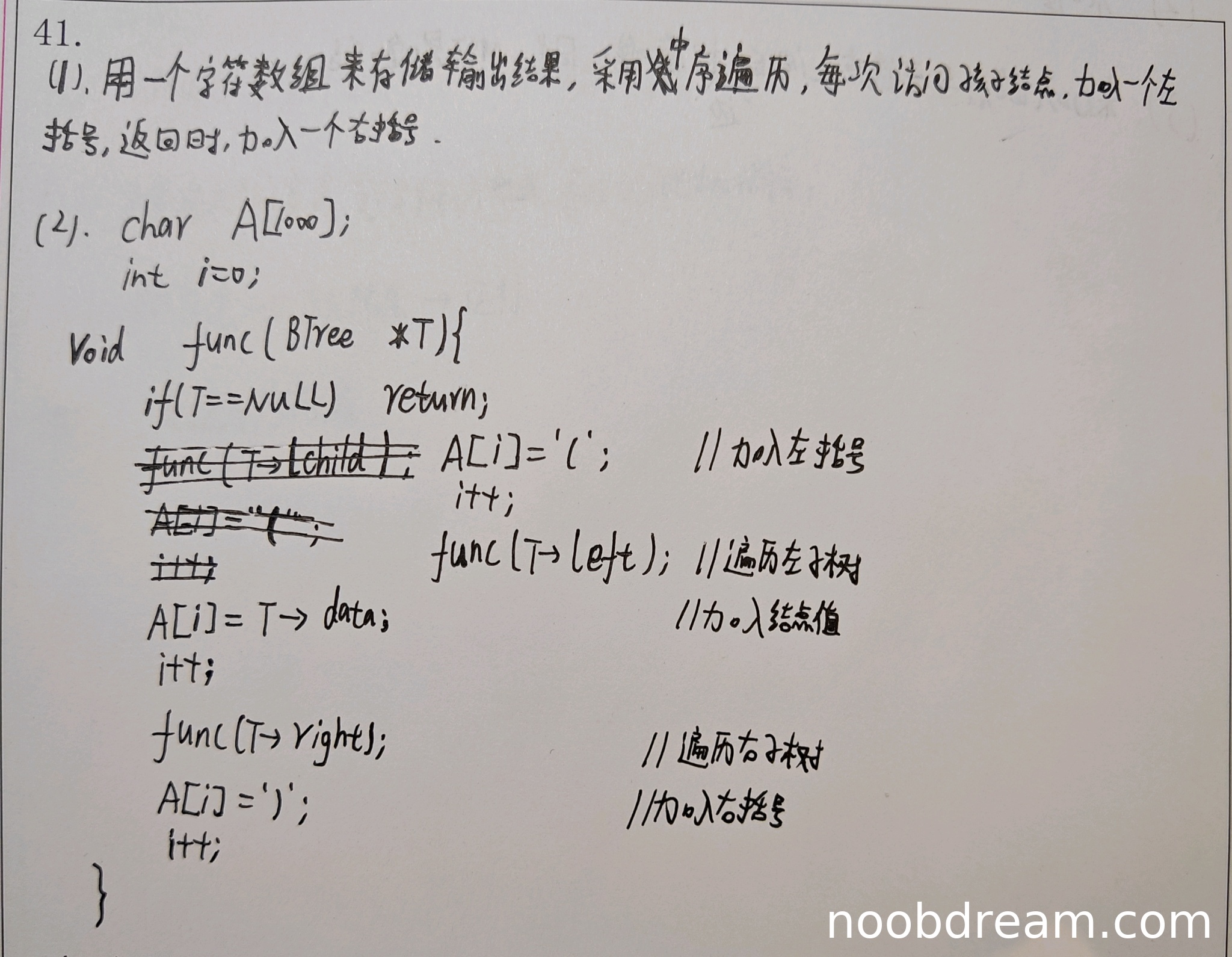 理由:学生答案的基本设计思想中提到"采用中序遍历"是正确的(第一次识别结果),这与标准答案一致。但答案中描述"每次访问孩子结点,加入一个左括号,返回时,加入一个右括号"这种加括号策略过于简单化,没有考虑操作符优先级和表达式层次深度,会导致不必要的括号添加。第二次识别结果写成了"先序遍历",这是错误的。综合考虑,给2分。