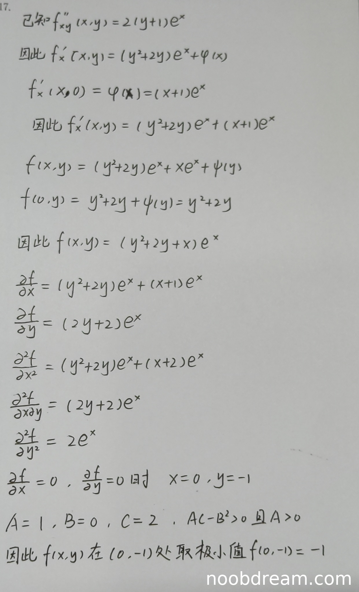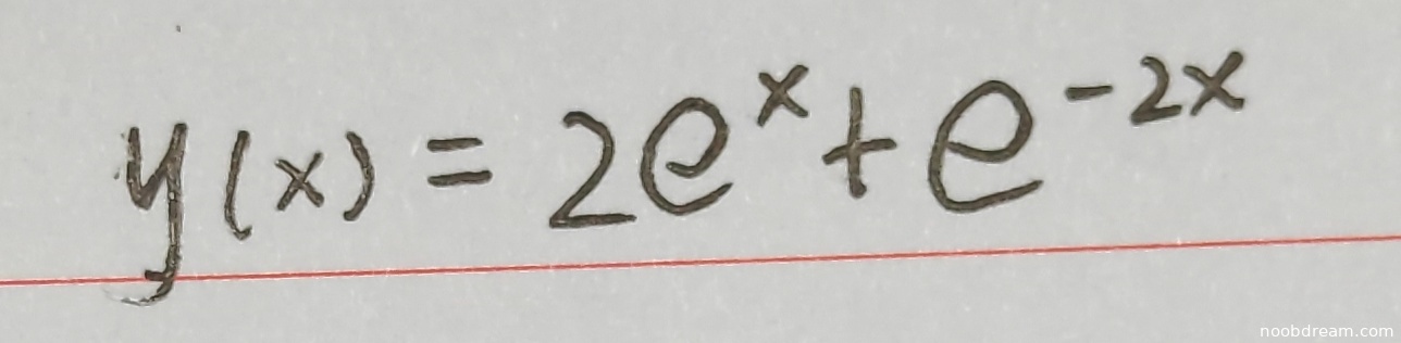 学生两次识别的答案均为 \(y(x)=2e^{x}+e^{-2x}\)。该微分方程 \(y''+y'-2y=0\) 的特征方程为 \(r^2+r-2=0\),解得 \(r=1\) 或 \(r=-2\),故通解为 \(y(x)=C_1 e^{x} + C_2 e^{-2x}\)。题目给出在 \(x=0\) 处取得极值3,即 \(y(0)=3\) 且 \(y'(0)=0\)。代入条件: