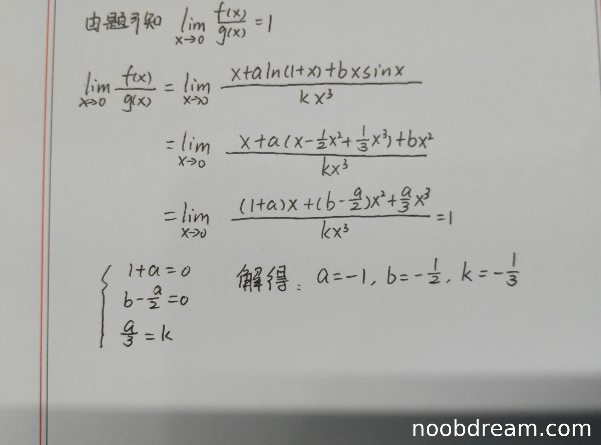 学生作答给出了两种识别结果,但内容实质相同。解题思路与标准答案中的方法一完全一致:利用等价无穷小的定义,将函数展开至三阶,通过比较系数建立方程组求解。具体步骤如下: