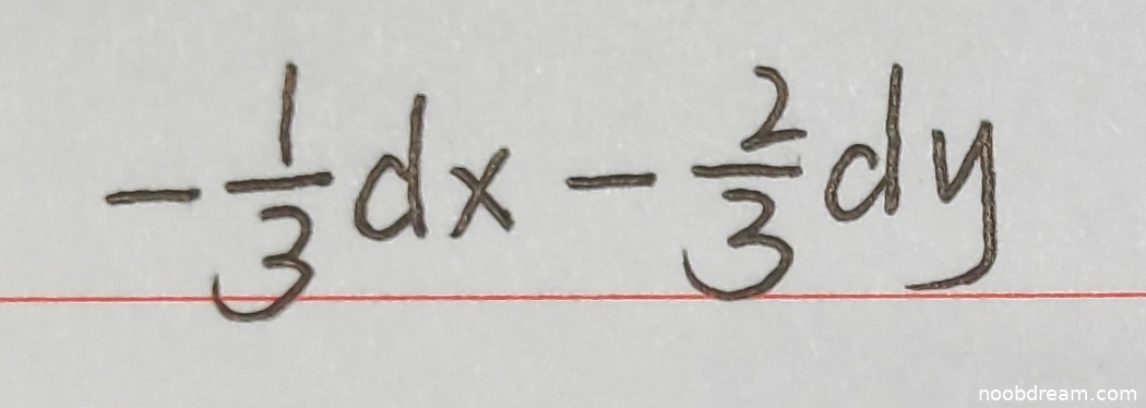 学生两次识别结果均为 \(-\frac{1}{3}dx - \frac{2}{3}dy\)。标准答案为 \(-\frac{1}{3}(dx + 2dy)\)。将学生答案展开:\(-\frac{1}{3}dx - \frac{2}{3}dy = -\frac{1}{3}(dx + 2dy)\),与标准答案完全等价。因此答案正确,逻辑无误,得满分4分。