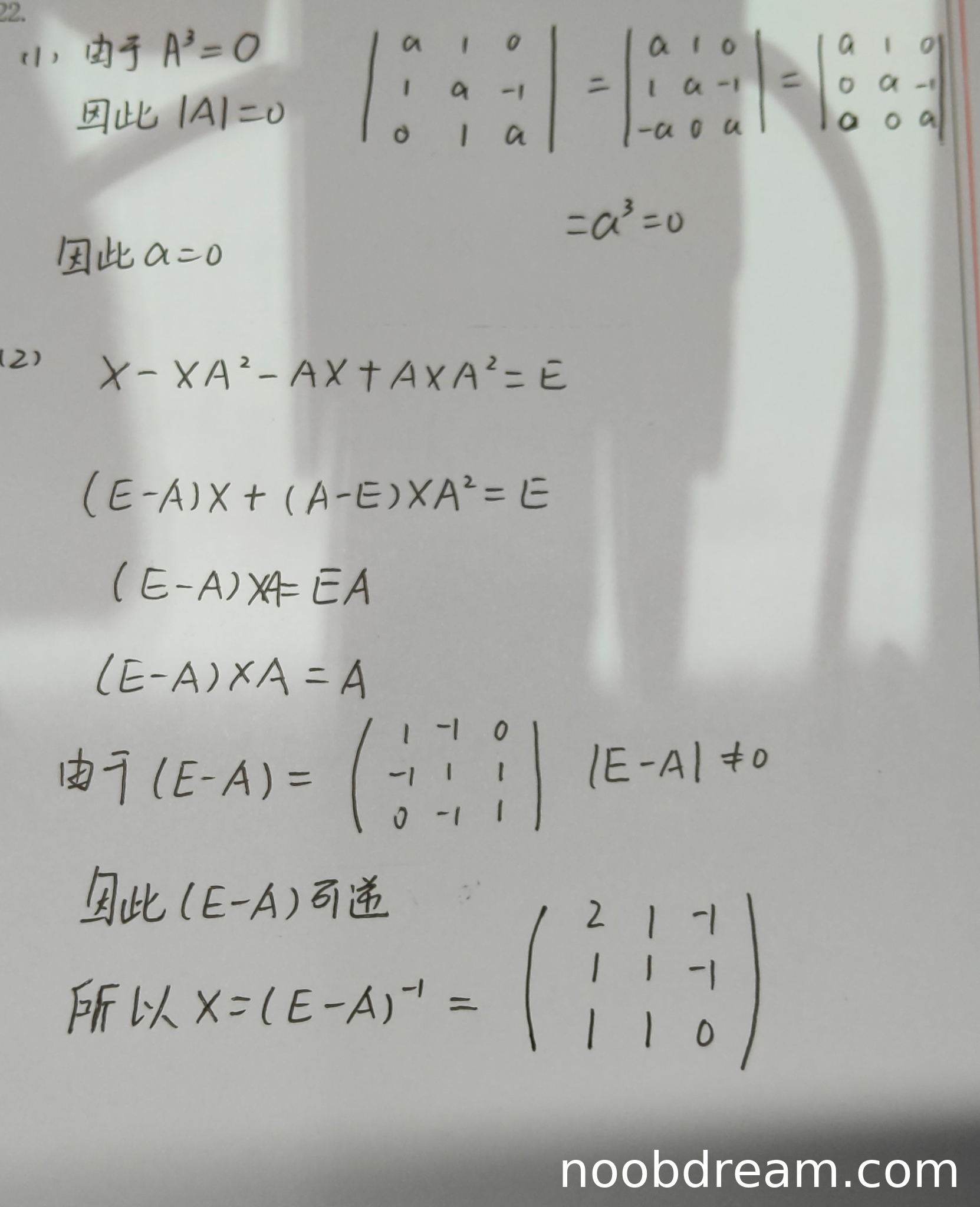学生正确得出 \(A^3 = O \Rightarrow |A| = 0\),并最终得到 \(a=0\)。虽然行列式化简过程在两次识别中均有笔误或不规范之处(例如第一次识别中第二步行列式书写有误,第二次识别中“\(\begin{vmatrix}a&1&0\\0&a - 1\\0&0&a\end{vmatrix}\)”的写法不规范),但核心思路和最终结果正确。根据“主要判断核心逻辑是否正确”的原则,这些书写问题不视为逻辑错误,不扣分。