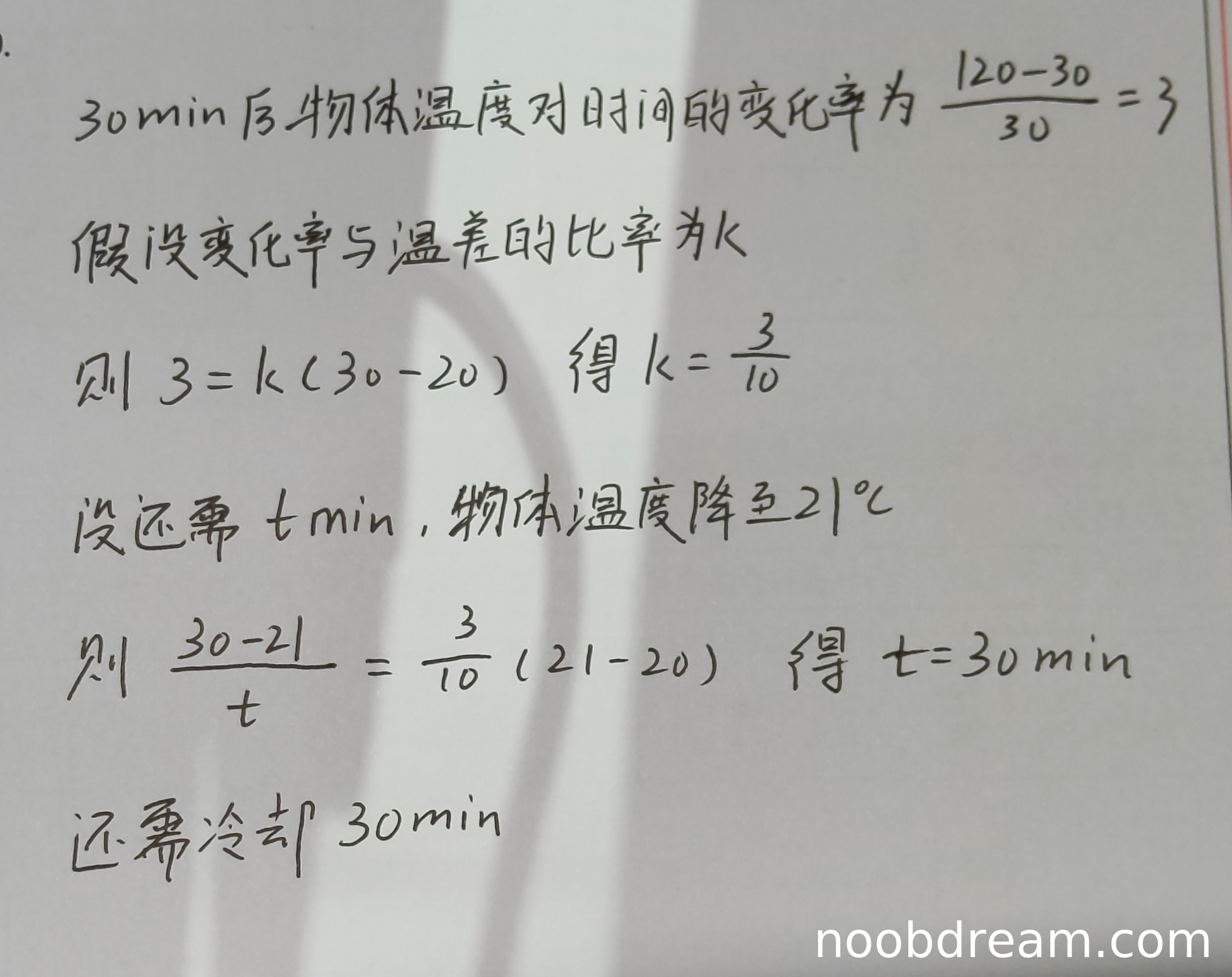 但是,学生的解题思路存在根本性的逻辑错误。题目明确说明“温度对时间的变化率与该时刻物体和介质的温差成正比”,这是一个微分关系,即 \( \frac{dx}{dt} = -k(x-m) \),其中 \( x(t) \) 是t时刻的温度。学生却错误地将30分钟内的平均降温速率 \( (120-30)/30 = 3 \) 当作某一时刻(30min时)的瞬时变化率,并以此建立比例关系。这种用平均变化率代替瞬时变化率的做法,不符合题目所依据的牛顿冷却定律的微分方程模型,属于概念性错误。