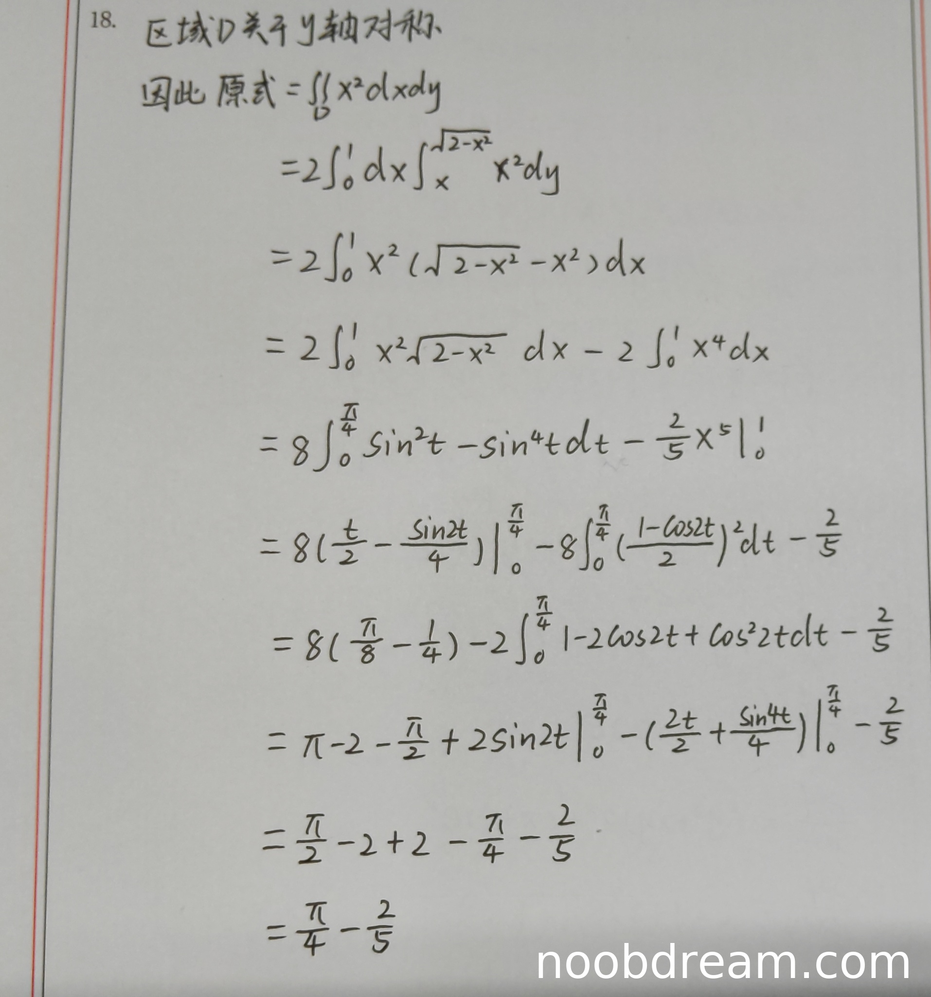学生作答给出了两次识别结果,核心思路与标准答案一致:利用区域关于y轴对称,将原积分化为∬D x² dxdy,再化为累次积分计算。最终结果正确为π/4 - 2/5。