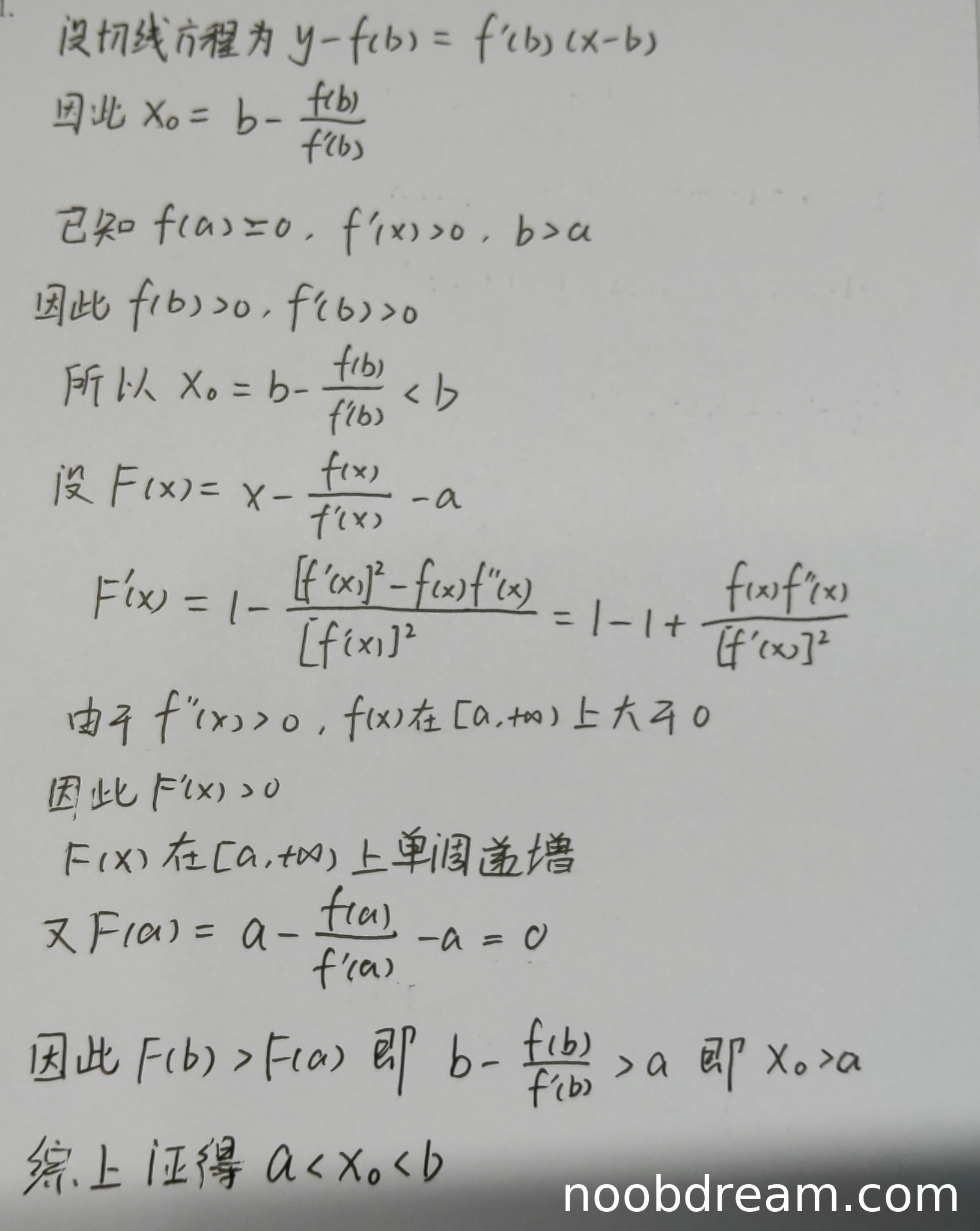 学生作答与标准答案思路不同,但逻辑正确。学生通过构造辅助函数 \(F(x) = x - \frac{f(x)}{f'(x)} - a\),利用导数判断其单调性来证明 \(x_0 > a\),方法正确。证明 \(x_0 < b\) 的部分与标准答案一致。整个证明过程严谨,没有逻辑错误。根据打分要求,思路正确不扣分。因此本题得满分11分。