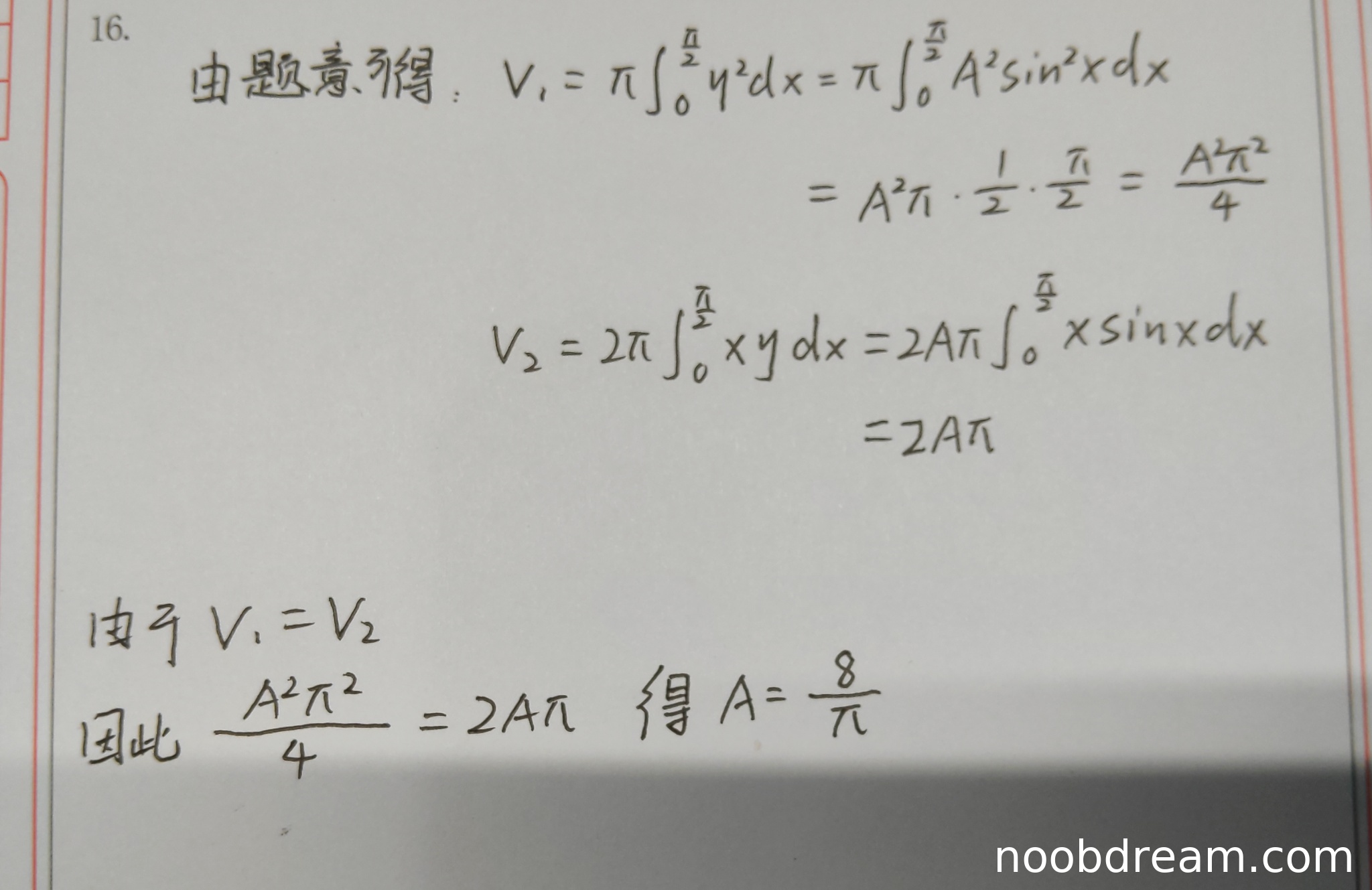 学生作答给出了完整的解题过程,思路与标准答案完全一致。计算V1时正确应用了旋转体体积公式和三角恒等变换,计算V2时正确应用了柱壳法(绕y轴旋转体积公式)和分部积分法。最终根据V1=V2正确解出A=8/π。整个解答逻辑清晰,计算无误,且两次识别结果均正确。