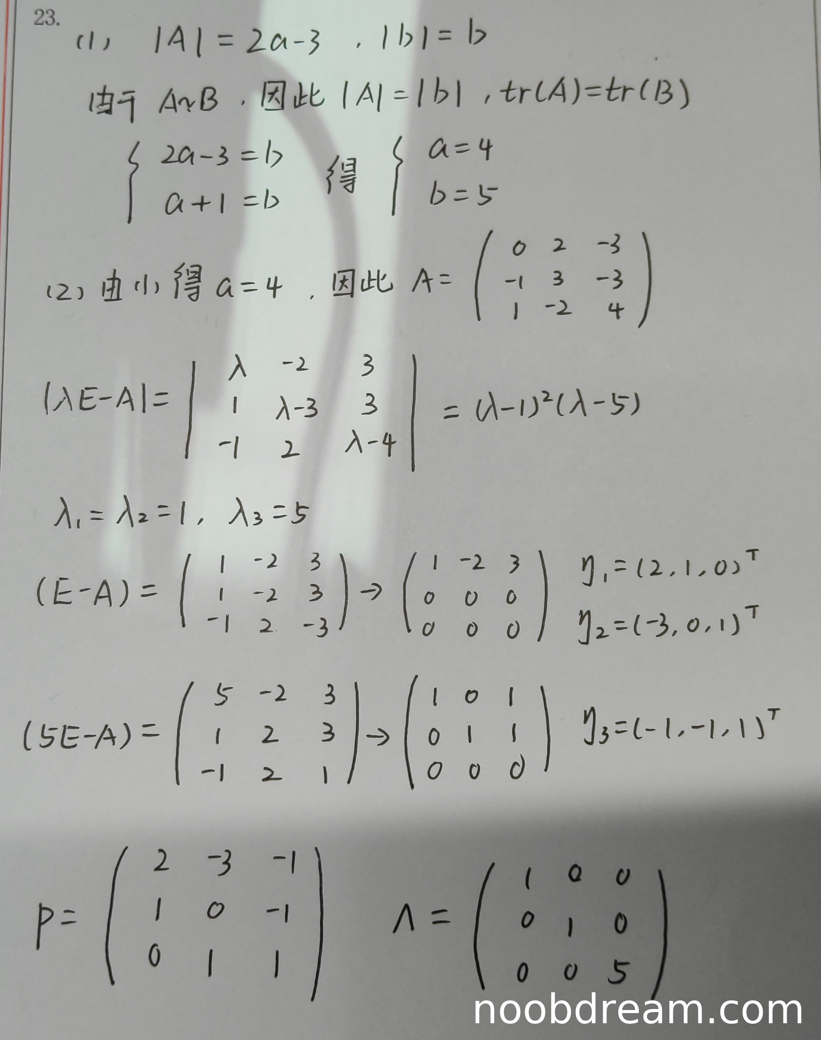 学生正确使用了矩阵相似的性质:迹相等和行列式相等。虽然第一次识别中行列式计算过程有误(|A| = 2a - 3 和 |B| = b 是错误的),但第二次识别中给出了正确的方程组(2a - 3 = b 和 a + 1 = b),并得到了正确的答案 a=4, b=5。考虑到识别误差的可能性,且最终答案正确,核心逻辑无误。扣1分是因为第一次识别中的行列式表达式错误,但鉴于第二次识别已纠正且整体正确,故给4分。