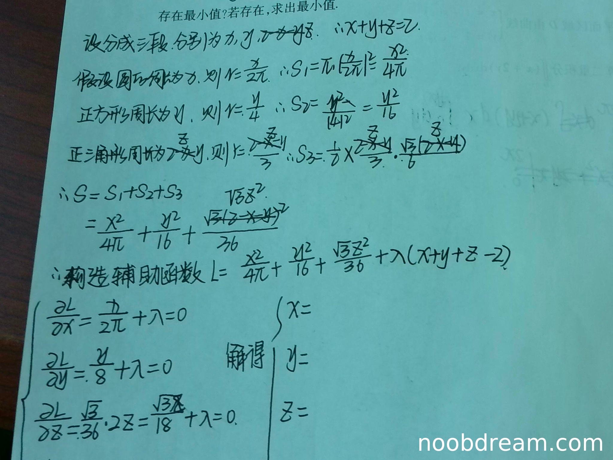 这些偏导数计算正确。虽然学生的求解过程没有完整写出解出的 \(x, y, z\) 具体值,也没有代入计算最小面积,但根据题目提供的两次识别结果,可以看出学生的思路和标准答案完全一致(只是变量含义不同:标准答案用半径、边长作为变量,学生用周长作为变量,但本质等价)。按照“思路正确不扣分”的原则,且学生已经正确列出了所有关键方程,应给予满分。识别中的一些不完整(如“解得”后面空白)可能是识别问题,不视为逻辑错误。
