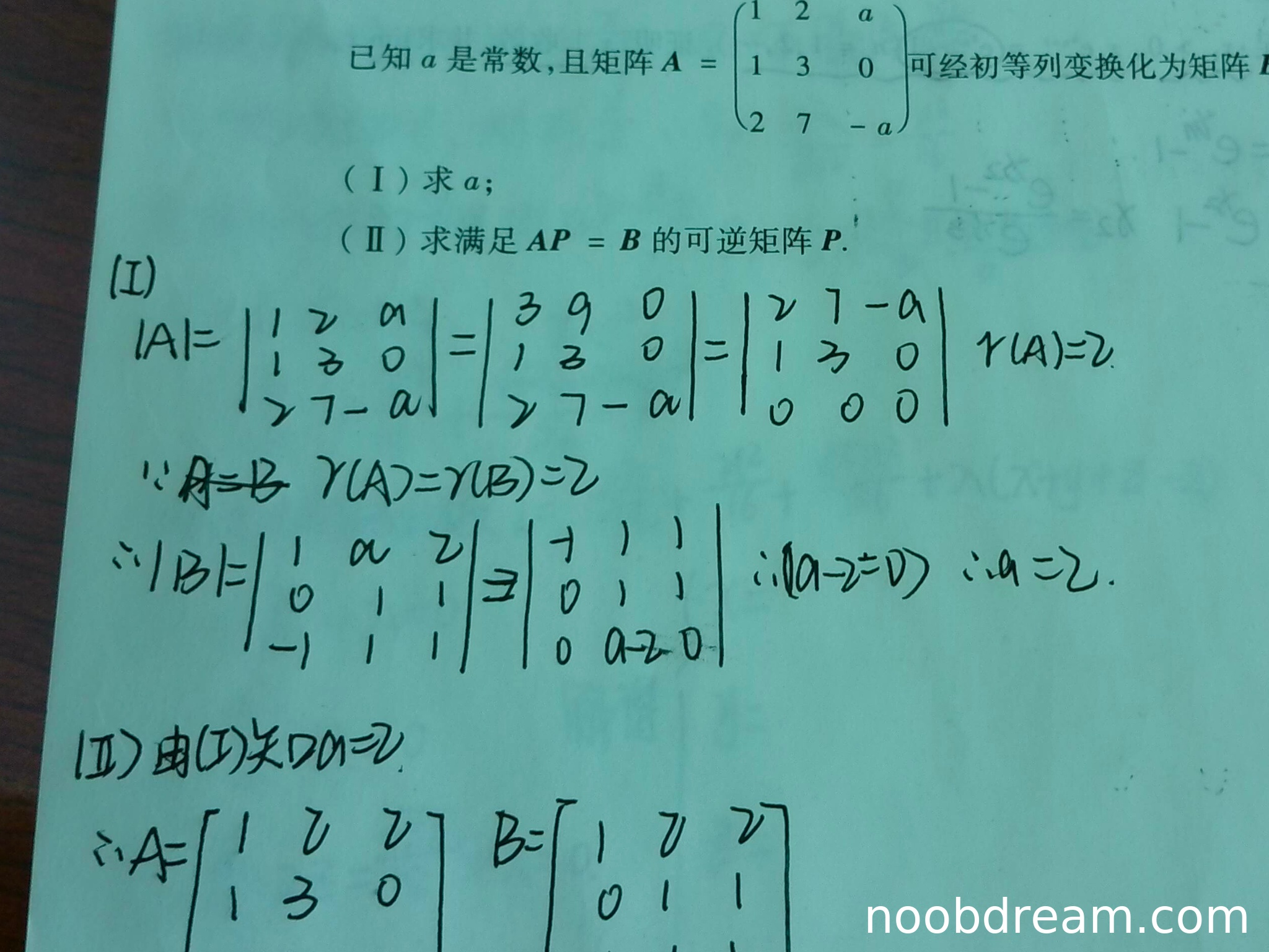 学生通过计算矩阵的秩和行列式,最终得出 a=2 的结论,与标准答案一致。虽然计算过程(如行列式变换)与标准答案不完全相同,但思路正确且结果正确。因此,第(1)问得满分5分。