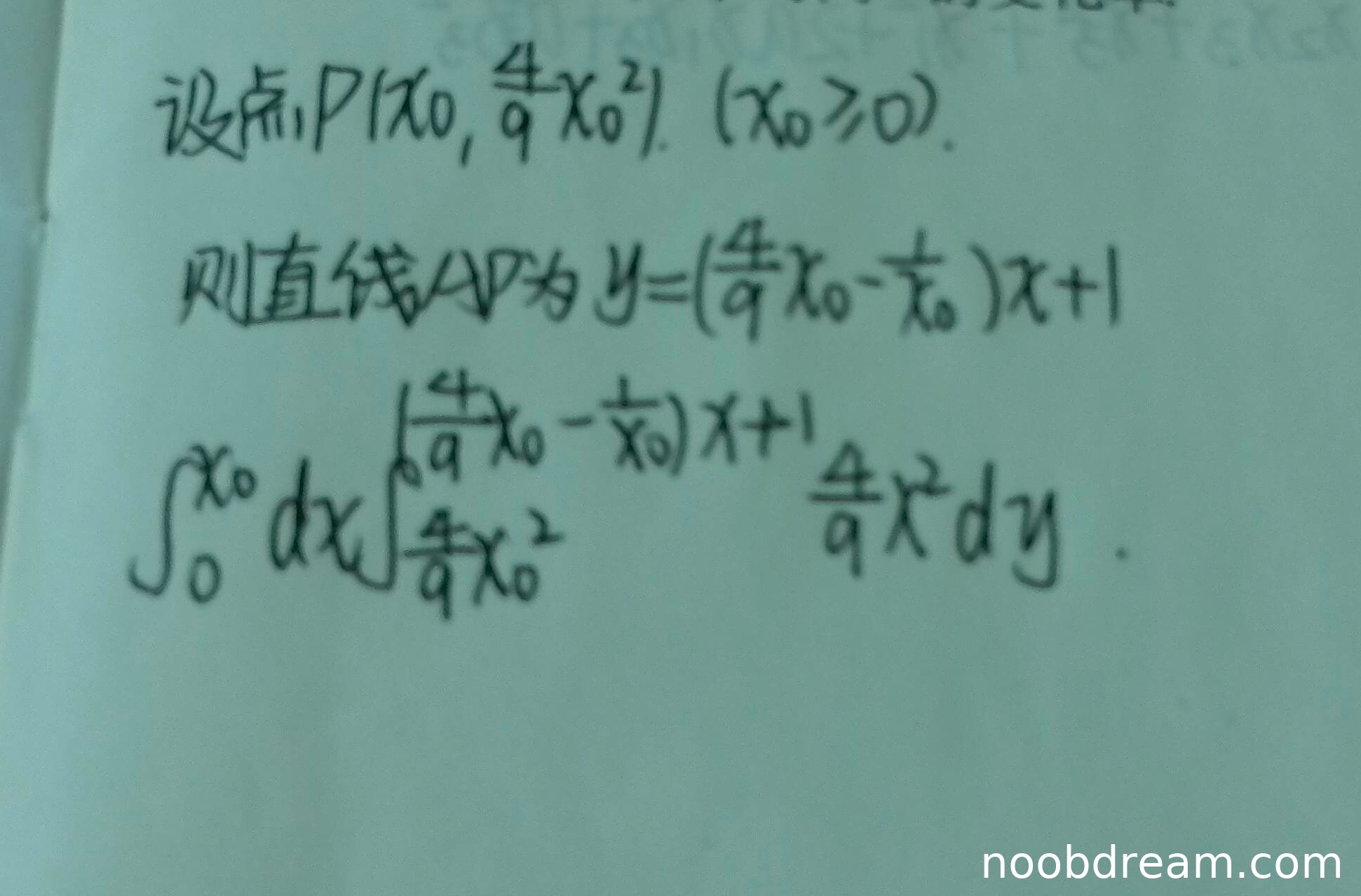 学生作答仅给出了设点和建立直线AP方程的过程,并尝试写出面积S的积分表达式,但积分表达式存在明显错误(例如积分上下限混淆、被积函数错误)。学生没有完成后续对S(x)的具体计算、对t求导以及代入数值求解变化率的步骤。因此,该作答只完成了问题的一小部分,且关键步骤有误。根据题目满分10分,酌情给予部分步骤分。