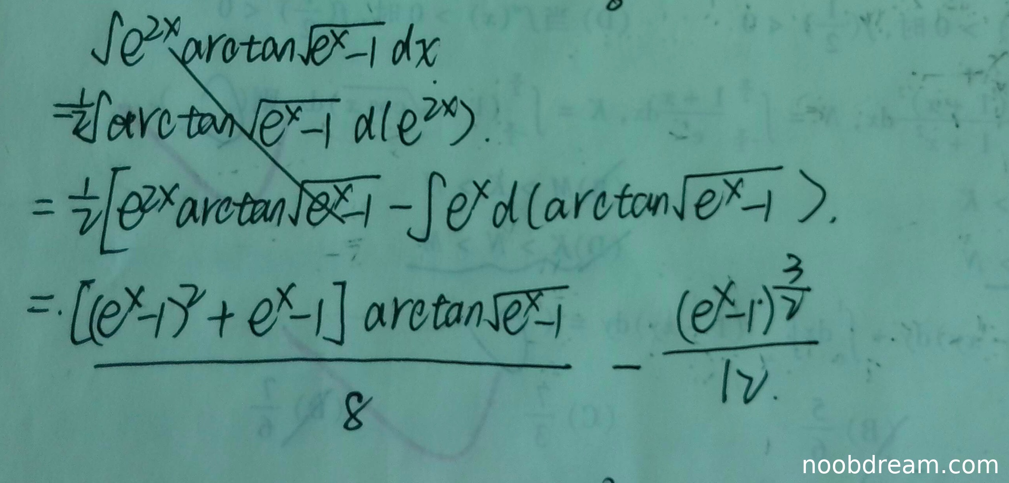 尽管学生尝试了分部积分和换元法的思路,但由于第一步就误解了被积函数,整个解答方向错误。根据打分要求,逻辑错误需要扣分,且最终答案不正确不能给满分。