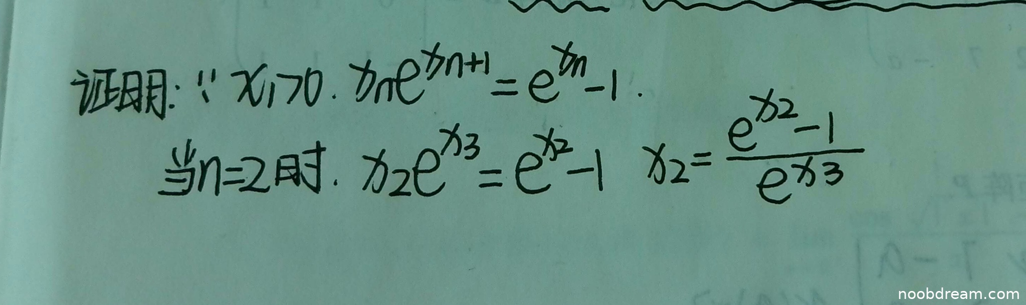此外,第一次识别结果中的“\(\ln e^{x_{n + 1}} = e^{x_{n}} - 1\)”显然是识别错误(应为 \(x_n e^{x_{n+1}} = e^{x_n} - 1\)),但根据禁止扣分原则,此误写不扣分。然而,核心问题是作答内容严重缺失且存在逻辑错误,无法获得分数。