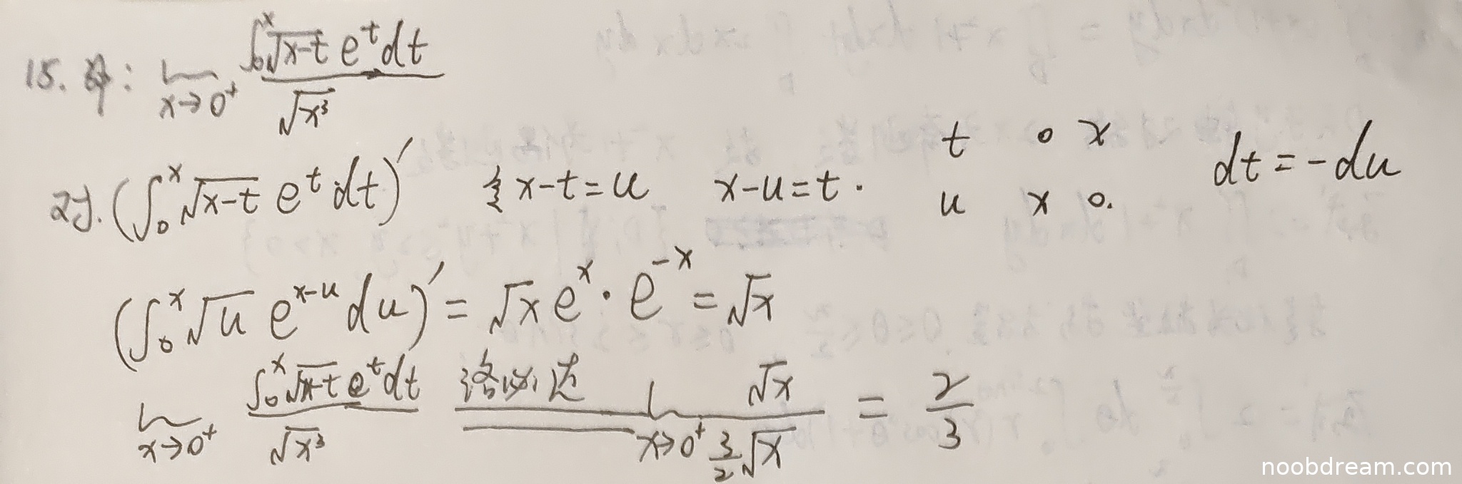 然而,在第一次识别的求导步骤中,存在一处关键的逻辑错误:学生写道“\((\int_{0}^{x} \sqrt{u} e^{x - u} du)' = \sqrt{x} e^{x} \cdot e^{-x} = \sqrt{x}\)”。这个推导过程跳跃且不严谨,没有正确应用含参变量积分的求导法则(莱布尼茨公式)。正确的求导过程应为:令 \(F(x) = e^{x} \int_{0}^{x} \sqrt{u} e^{-u} du\),则 \(F'(x) = e^{x} \int_{0}^{x} \sqrt{u} e^{-u} du + e^{x} \cdot \sqrt{x} e^{-x} = e^{x} \int_{0}^{x} \sqrt{u} e^{-u} du + \sqrt{x}\)。在应用洛必达法则求 \(x \to 0\) 的极限时,第一项 \(e^{x} \int_{0}^{x} \sqrt{u} e^{-u} du\) 是比 \(\sqrt{x}\) 更高阶的无穷小,因此极限值由 \(\sqrt{x}\) 项决定。学生虽然跳过了中间步骤直接得到了 \(\sqrt{x}\) 这一正确结果,但推导过程存在缺陷。