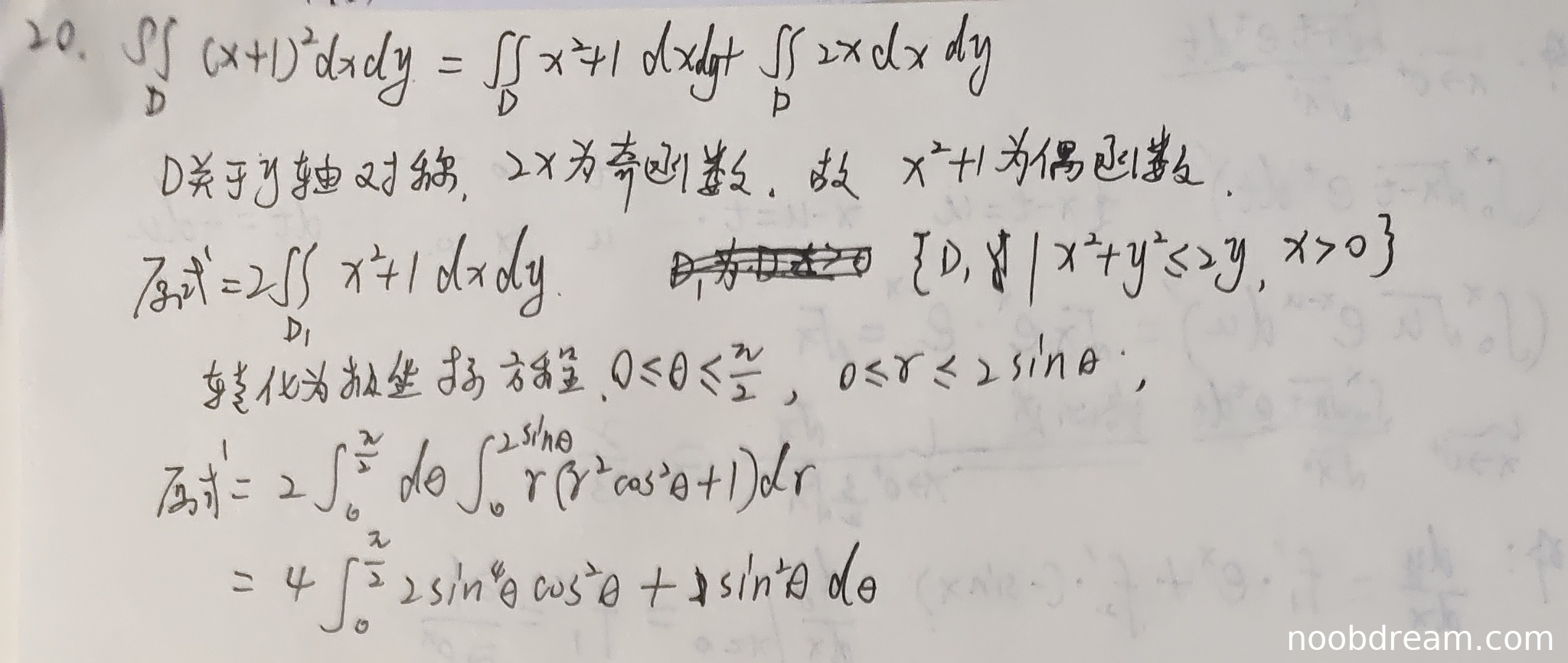 学生作答的整体思路是正确的:利用积分区域关于y轴的对称性简化被积函数,然后转换为极坐标进行计算。具体步骤分析如下:
