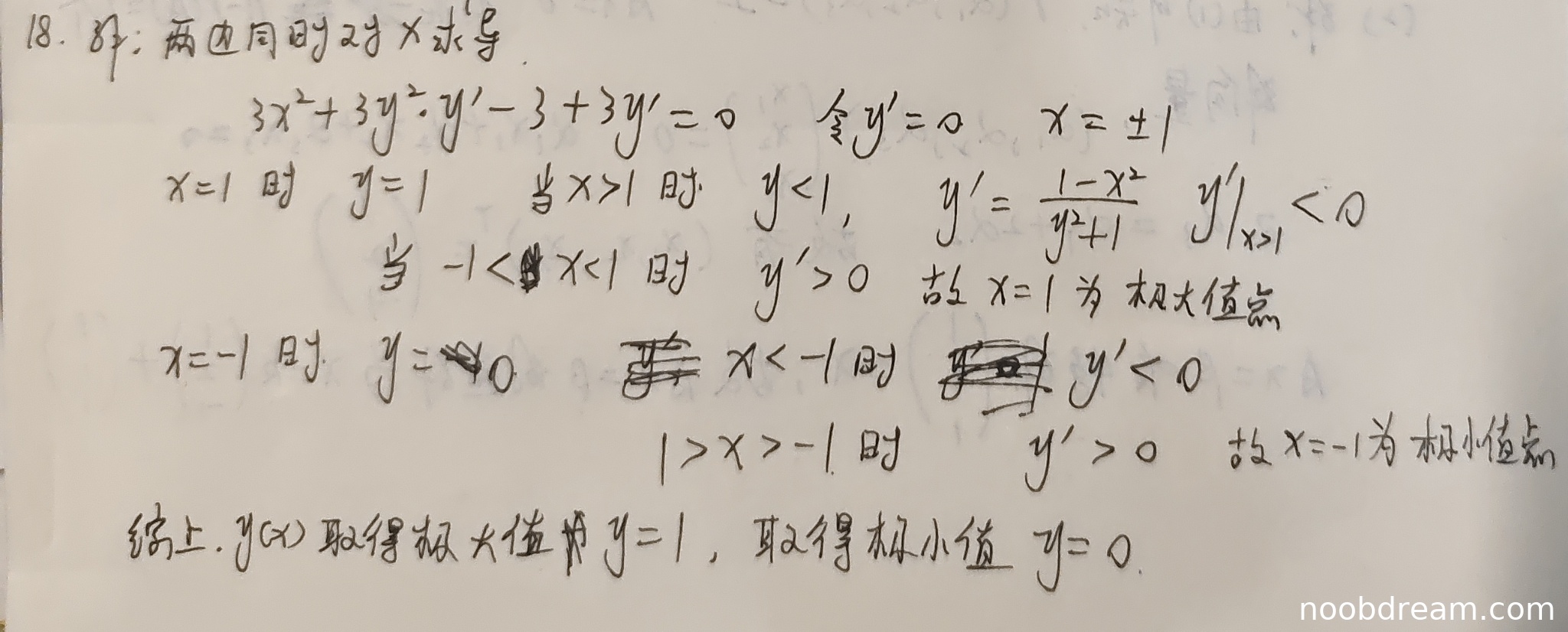 学生作答与标准答案思路不完全一致,但方法正确。学生通过隐函数求导得到 \(y' = 0\) 时 \(x = \pm 1\),并代入原方程得到对应 \(y\) 值。判断极值时,学生没有使用二阶导数检验,而是通过分析一阶导数 \(y' = \frac{1 - x^2}{y^2 + 1}\) 在驻点两侧的符号变化来判断极值类型,该方法在隐函数极值问题中也是正确的。最终得出的极大值点 \((1, 1)\) 和极小值点 \((-1, 0)\) 与标准答案一致。