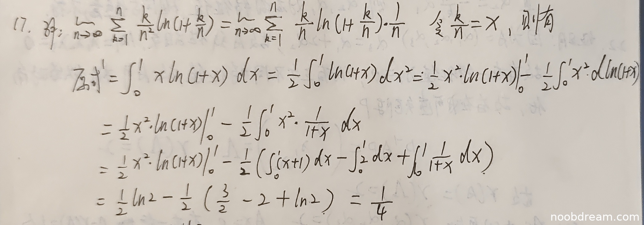 学生作答整体思路正确,将极限和式转化为定积分 \(\int_{0}^{1} x \ln(1+x) \, dx\),然后使用分部积分法求解,最终得到正确答案 \(\frac{1}{4}\)。在两次识别结果中,虽然具体积分化简步骤略有差异(第一次识别中拆分积分时出现笔误,第二次识别中拆分正确),但最终计算结果都正确。根据“只要其中有一次回答正确则不扣分”的原则,且核心逻辑无误,故不扣分。