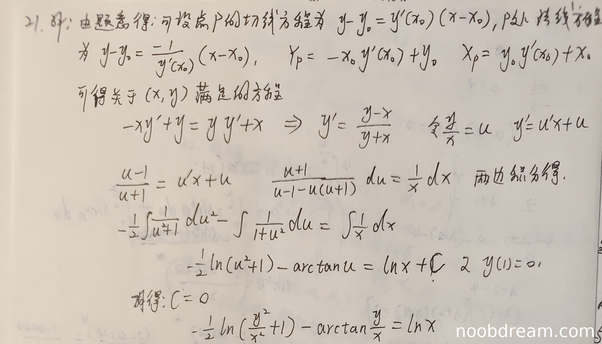 本题满分11分。学生作答整体思路正确,从切线、法线方程出发,得到关系式 \( -xy' + y = yy' + x \),进而推导出微分方程 \( y' = \frac{y-x}{y+x} \),然后通过变量代换 \( u = \frac{y}{x} \) 求解,并利用初始条件 \( y(1)=0 \) 确定常数。这些关键步骤与标准答案一致。
