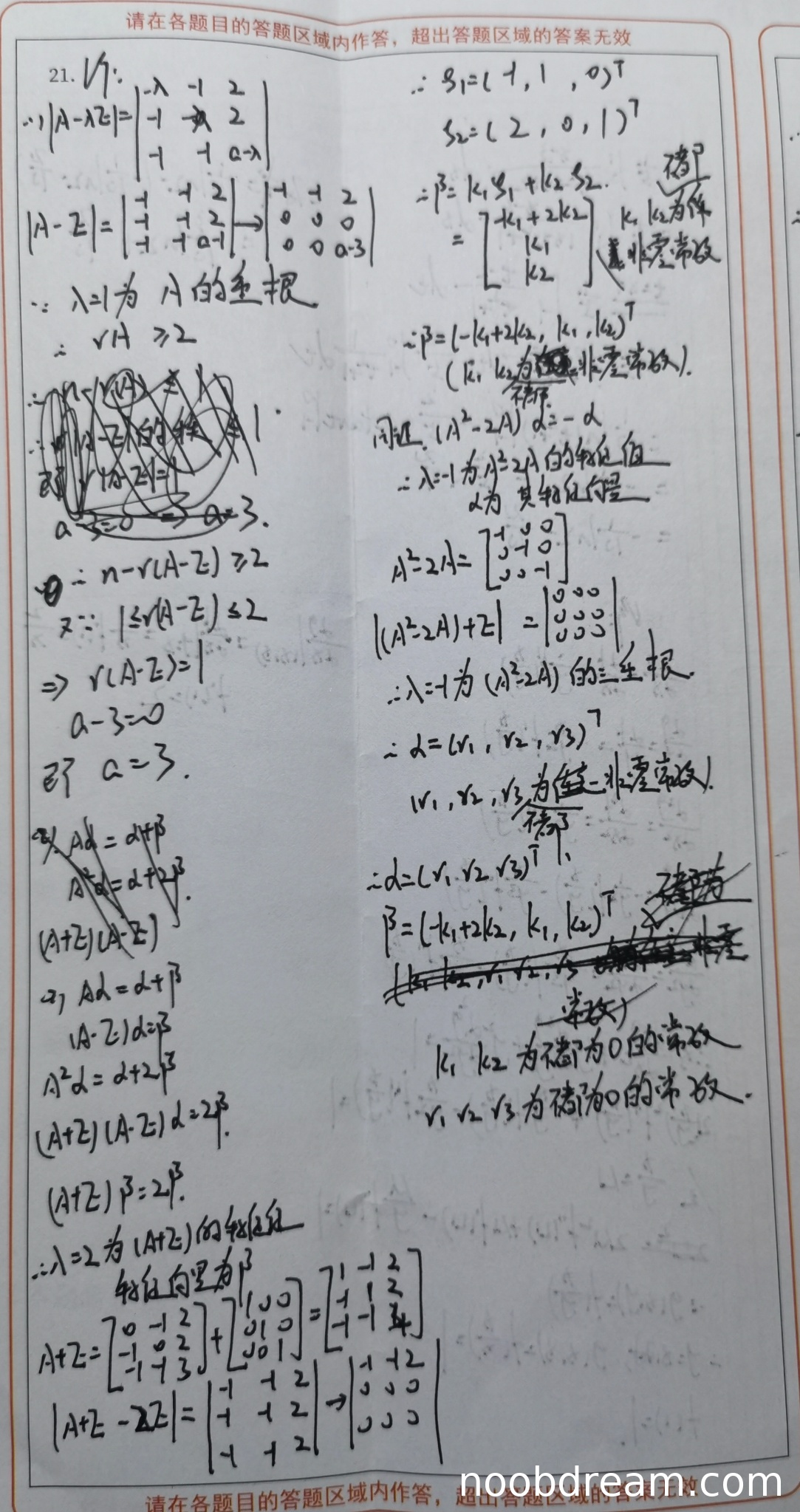 学生作答中,第一次识别给出的矩阵与题目中矩阵不一致(第一行第一列写成了λ-1,第二行第二列写成了λ-2,第三行第三列写成了α-λ),但后续计算|A-E|时,矩阵写成了正确的形式(除了第三行第三列是α-1),并通过行变换得到α-3=0,从而得出a=3。第二次识别给出的矩阵A与题目完全不符(第一行第一列为-1,第二行第二列为a,第三行第三列为a-1),但通过行列式变换也得到a-3=0,即a=3。虽然两次识别中矩阵的初始写法都有错误,但最终都得到了正确的a=3。考虑到识别可能带来的字符误写(如将0识别为-1等),且核心逻辑(利用λ=1是重根推出|A-E|=0且r(A-E)=1,从而得到a=3)正确,因此不扣分。得6分。