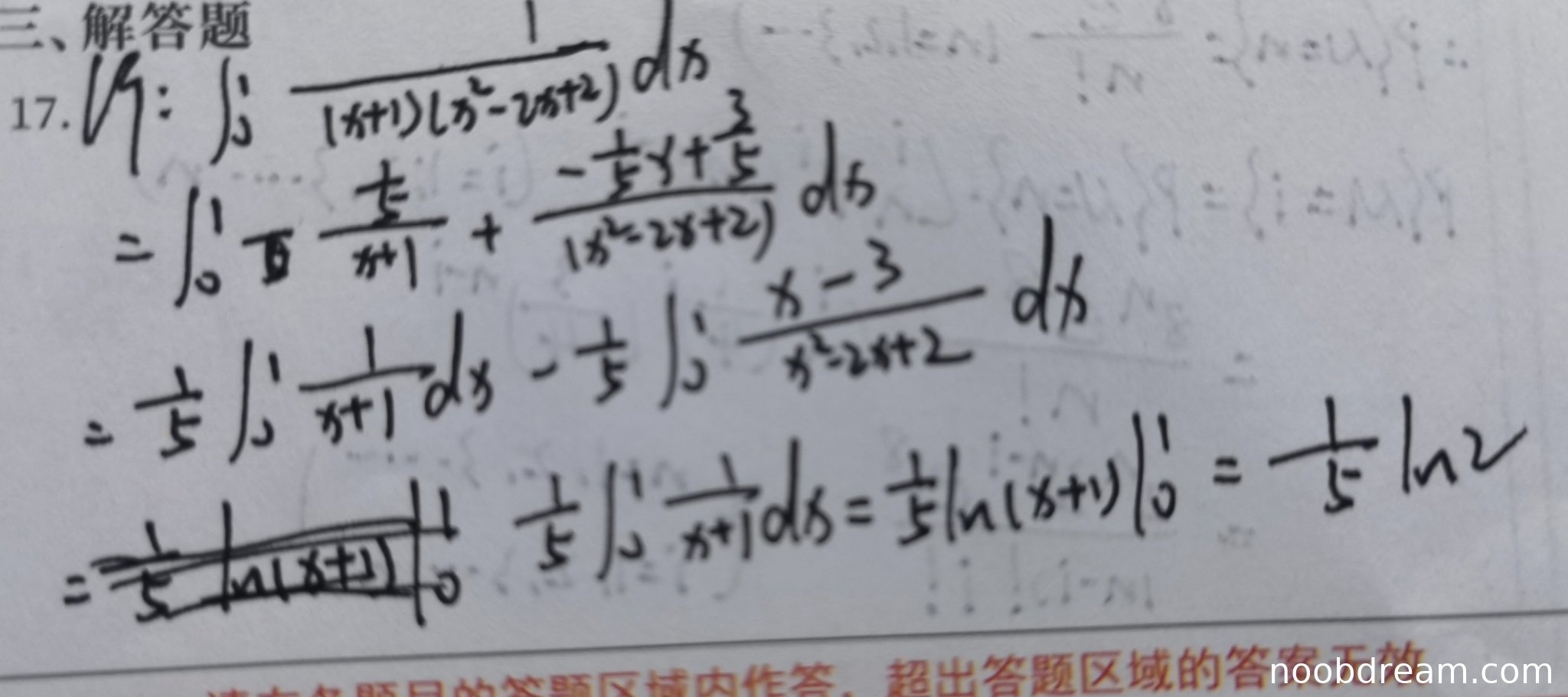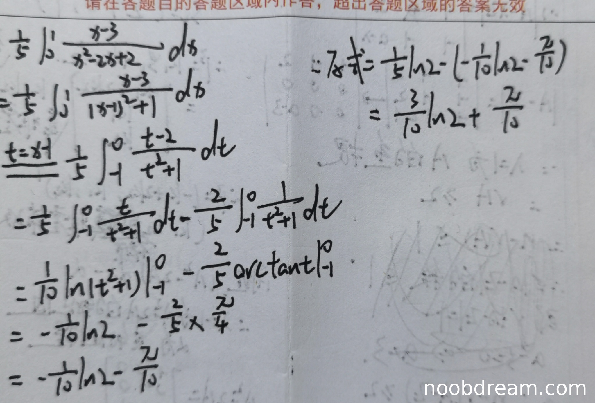 学生作答提供了两次识别结果,其中第一次识别结果在计算过程中存在一处逻辑错误:在部分分式分解后,直接写出了 \(\frac{1}{5}\int_{0}^{1}\frac{x - 3}{x^{2}-2x + 2}dx\),这与标准分解形式 \(\frac{-\frac{1}{5}x+\frac{3}{5}}{x^{2}-2x + 2}\) 不一致(分子符号和常数项有误)。然而,在后续计算中,学生通过换元 \(t = x-1\) 将积分转化为 \(\frac{1}{5}\int_{-1}^{0}\frac{t - 2}{t^{2}+1}dt\),并正确计算出了该部分积分的值为 \(-\frac{1}{10}\ln2-\frac{\pi}{10}\)。最后,学生将第一部分积分 \(\frac{1}{5}\ln2\) 与第二部分积分结果相加,得到了与标准答案一致的最终结果 \(\frac{3}{10}\ln2+\frac{\pi}{10}\)。尽管中间步骤的表达式与标准分解不完全一致,但最终计算过程和结果正确,且第二次识别结果展示了完整且正确的标准解法。根据打分要求“思路正确不扣分”,且最终答案正确,因此不扣分。但第一次识别中出现的表达式不一致属于逻辑错误,根据“逻辑错误扣分”原则应扣分。考虑到题目总分10分,且错误出现在关键步骤,但最终答案正确,且第二次识别完全正确,综合判定扣1分。