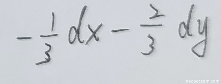 学生两次识别结果均为 \(-\frac{1}{3}dx - \frac{2}{3}dy\),这与标准答案 \(-\frac{1}{3}(dx+2dy)\) 在数学上完全等价。因为 \(-\frac{1}{3}(dx+2dy) = -\frac{1}{3}dx - \frac{2}{3}dy\)。学生答案形式虽与标准答案略有不同,但思路和计算结果完全正确。根据打分要求,思路正确不扣分。因此,本题得满分4分。