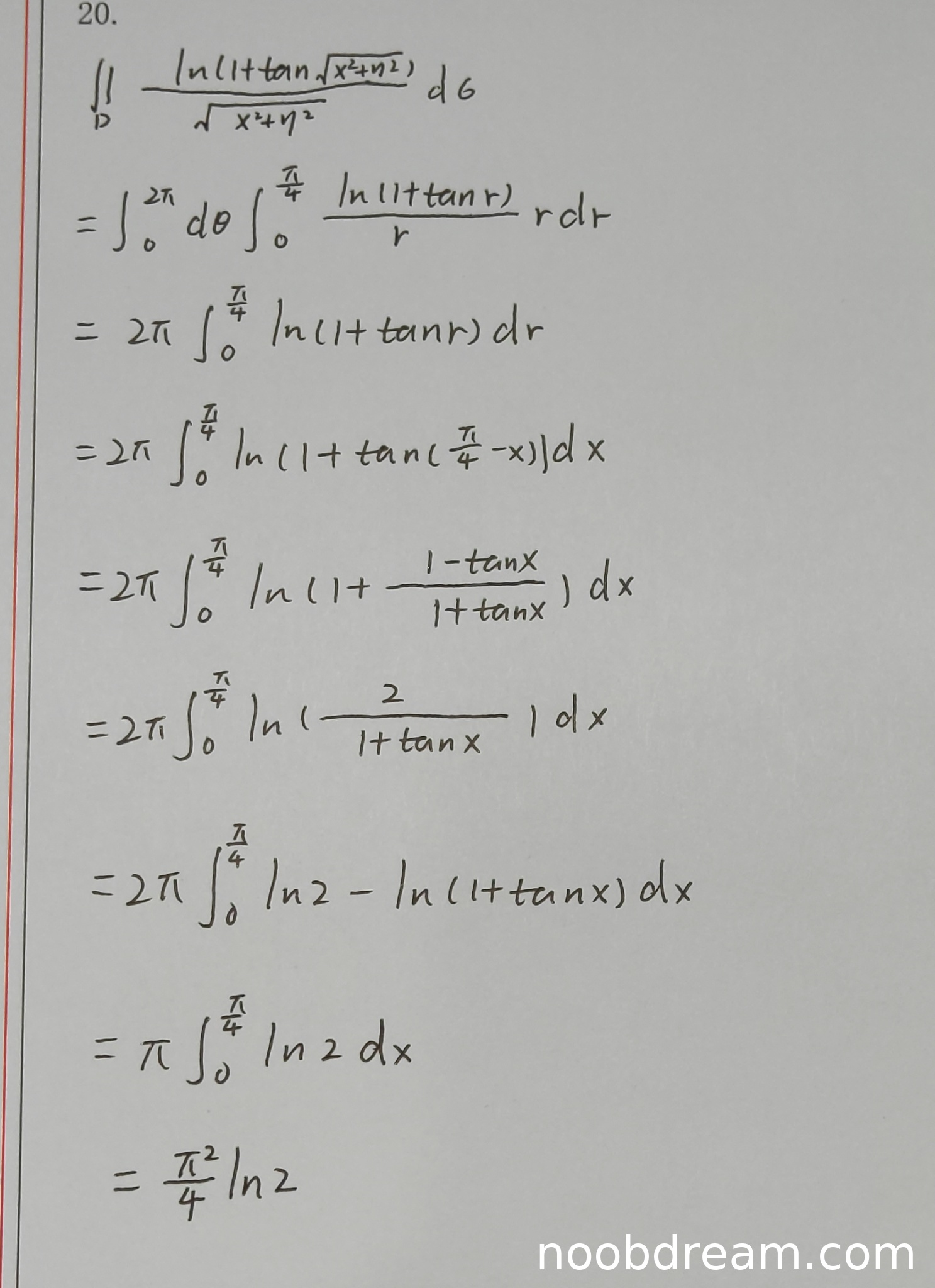 考虑到学生后续的积分计算技巧(如利用r=π/4 - x的换元)运用正确,思路有可取之处,但起始错误严重。扣分应主要针对区域判断和极坐标设置错误。给予部分分数。
