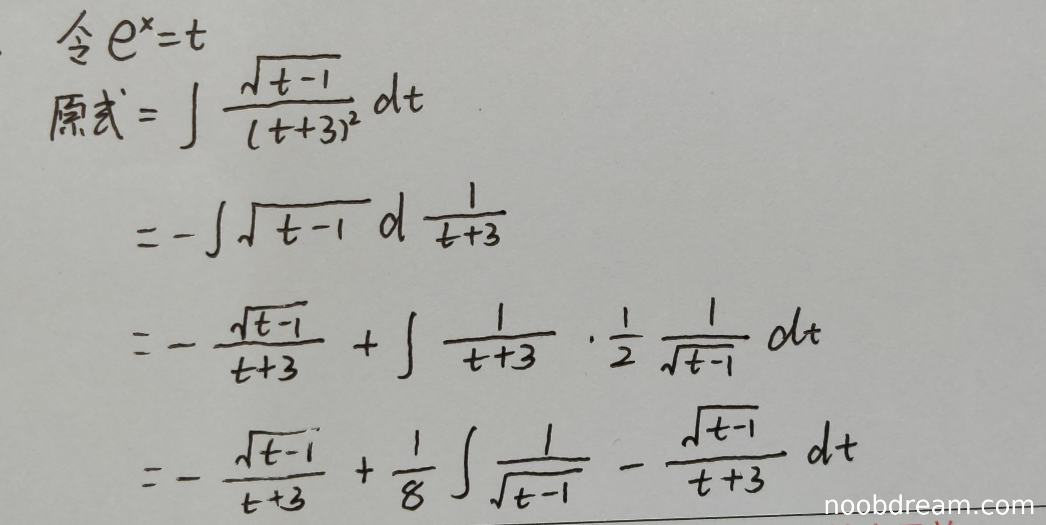 关键错误出现在分部积分后的处理:学生得到: \[ -\frac{\sqrt{t - 1}}{t + 3}+\frac{1}{2}\int\frac{1}{(t + 3)\sqrt{t - 1}}dt \] 这一步是正确的。但接下来对 \(\frac{1}{2}\int\frac{1}{(t + 3)\sqrt{t - 1}}dt\) 的变形出现严重逻辑错误。学生写道: \[ \frac{1}{2}\int\frac{1}{(t + 3)\sqrt{t - 1}}dt = \frac{1}{8}\int\frac{1}{\sqrt{t - 1}}dt - \frac{1}{8}\int\frac{\sqrt{t - 1}}{t + 3}dt \] 这个等式不成立。通过简单验证(例如令 \(t=2\) 代入两边被积函数)可知两边不相等。这个错误的代数变形导致了后续所有计算偏离正确方向。