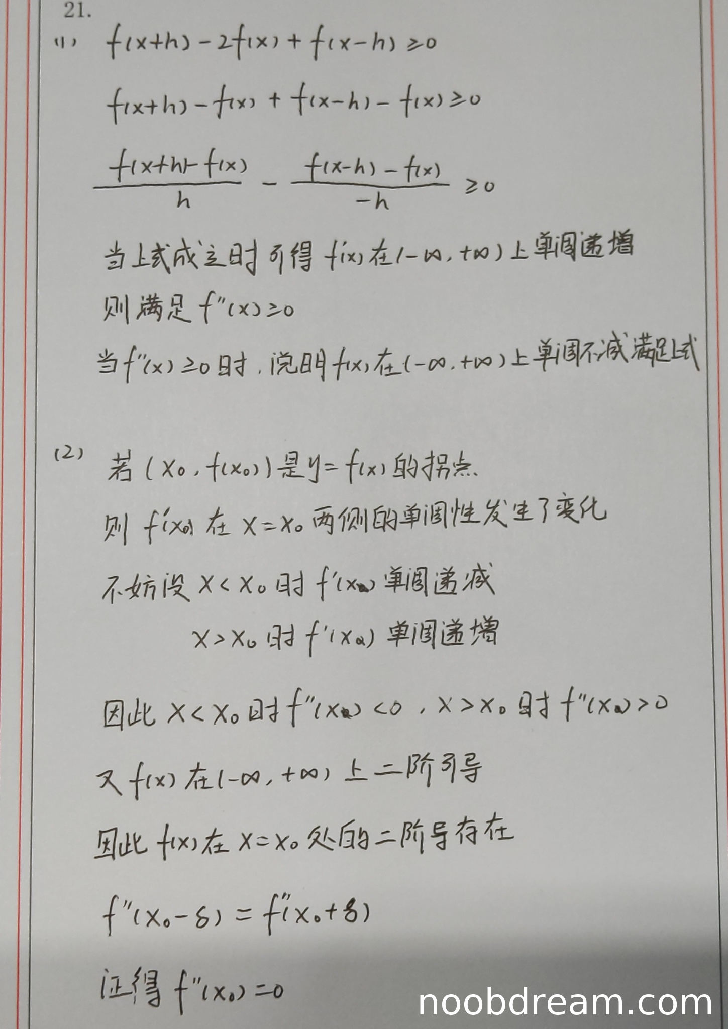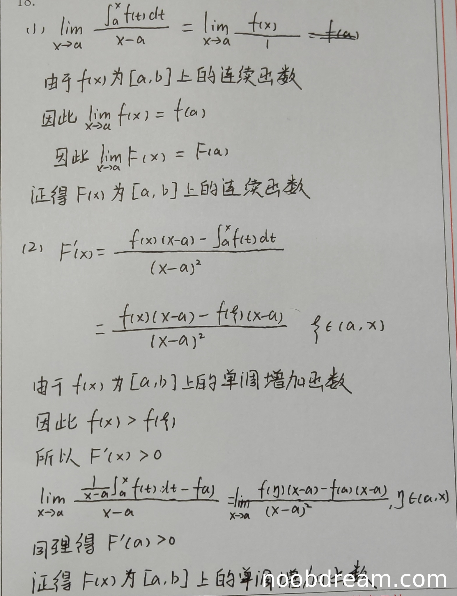 然而,学生在证明 \(F'(a) > 0\) 时,试图用导数定义和积分中值定理进行计算:\(\lim_{x \to a} \frac{F(x)-F(a)}{x-a} = \lim_{x \to a} \frac{f(\eta)(x-a) - f(a)(x-a)}{(x-a)^2}\)。这里存在一个关键错误:当使用积分中值定理于分子 \(\int_a^x f(t)dt\) 时,得到的是 \(f(\eta)(x-a)\),其中 \(\eta \in (a, x)\)。因此分子变为 \(f(\eta)(x-a) - f(a)(x-a) = (f(\eta)-f(a))(x-a)\)。极限式成为 \(\lim_{x \to a} \frac{f(\eta)-f(a)}{x-a}\)。由于 \(\eta\) 依赖于 \(x\) 且 \(\eta \in (a, x)\),这个极限并不直接等于 \(f'(a)\)(题目未给出 \(f\) 可导的条件),也无法直接由 \(f\) 单调增加推出其大于0。实际上,由 \(f\) 单调增加和 \(\eta > a\),只能得到 \(f(\eta) \ge f(a)\),因此 \(f(\eta)-f(a) \ge 0\),但分母 \(x-a > 0\),所以整个分式 \(\ge 0\)。要严格证明 \(F'(a) > 0\) 需要更细致的分析(或利用(Ⅰ)中已证的连续性及 \(F'(x)>0\) 对 \(x>a\) 成立来推断)。学生此处的推理不严谨,存在逻辑跳跃。