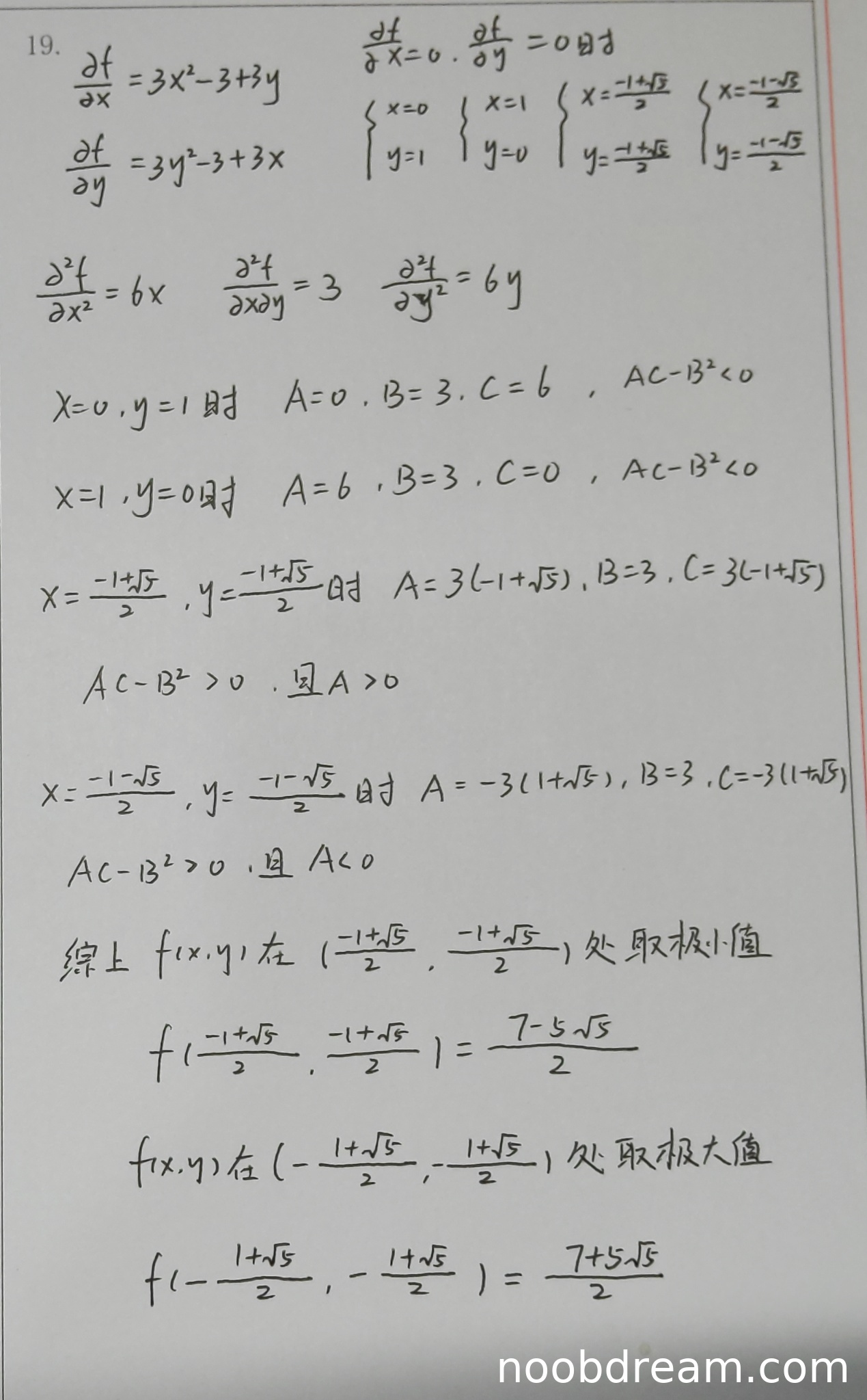 学生作答整体思路正确,完整地完成了求偏导数、解方程组找驻点、计算二阶偏导数、利用判别式判断极值类型并计算极值的过程。具体分析如下: