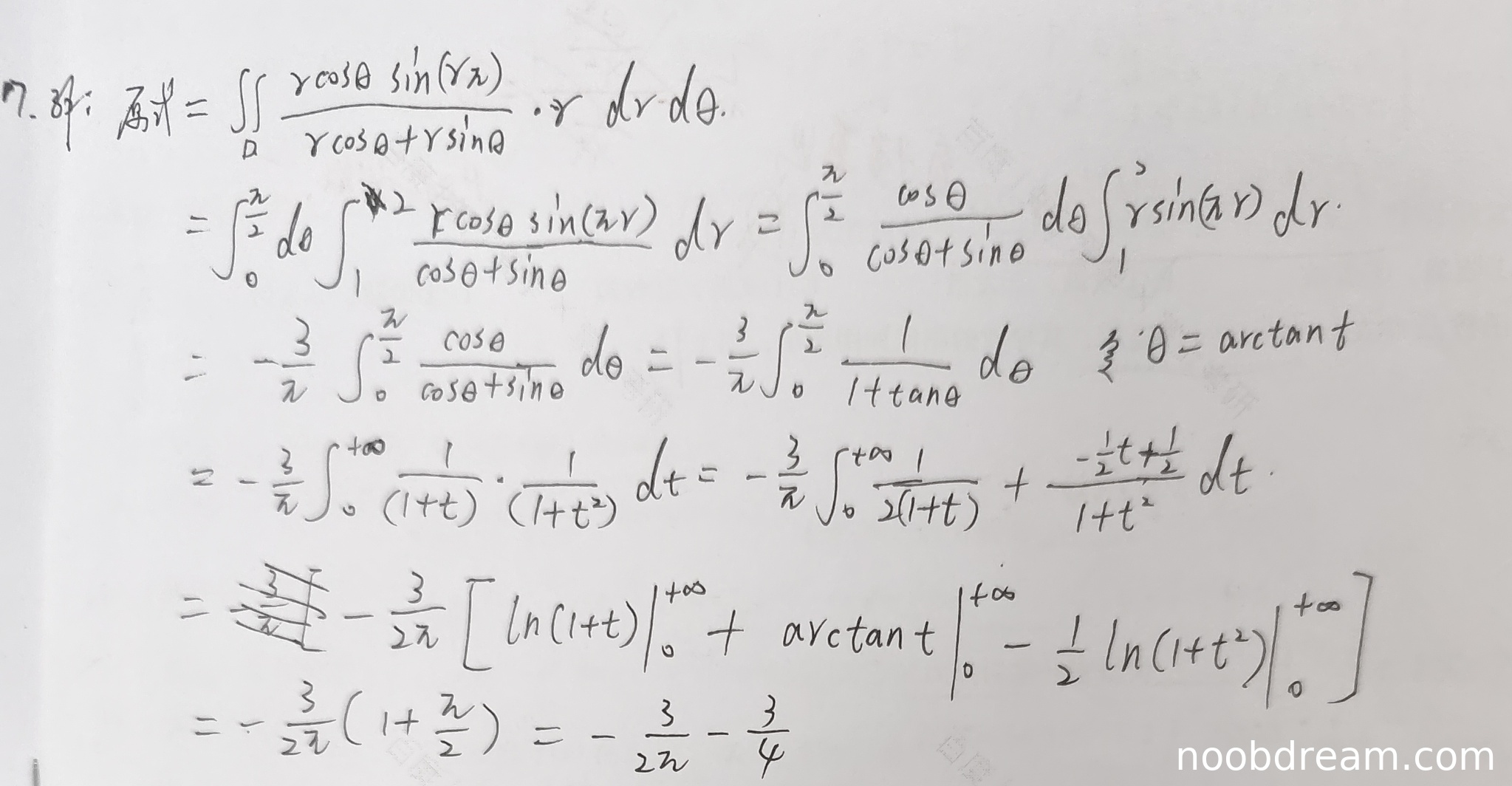 学生作答提供了两种识别结果,但两种结果的核心思路和最终答案均与标准答案不同。标准答案利用了区域的对称性简化被积函数,将原积分转化为对 \(\sin(\pi r)\) 在极坐标下的积分,最终结果为 \(-\frac{3}{4}\)。而学生作答的基本思路是直接进行极坐标变换并分离变量积分,但在关键步骤中存在逻辑错误: