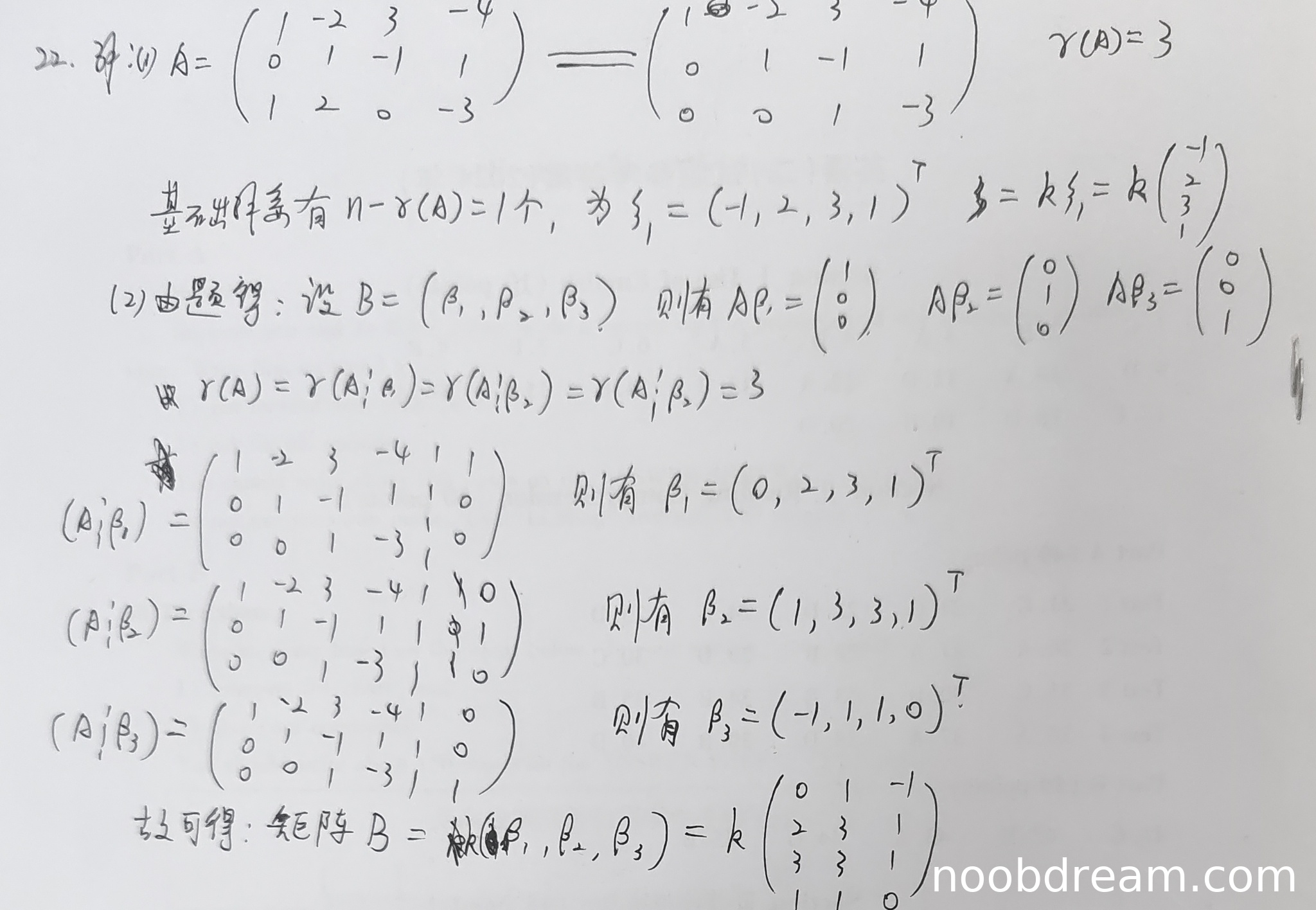 第1次识别中,学生将AB=E的三个方程右端向量写错(写成了(0,0,0)^T、(0,1,0)^T、(0,0,1)^T),且后续使用了A^T等错误符号,解法完全错误,仅得到三个特解,未包含通解形式,因此按0分处理。第2次识别中,学生正确设B=(β1,β2,β3),并正确写出三个非齐次方程组Aβ1=(1,0,0)^T等,且指出系数矩阵秩与增广矩阵秩相等(均为3),说明方程组有解。但在具体求解时,学生错误地将增广矩阵写成了已经行最简的3×5矩阵(实际上原矩阵A是3×4,增广后应为3×5,但学生写出的矩阵中前4列已经是行最简形,且常数项位置数字与标准答案中的特解不对应),导致求出的β1、β2、β3只是三个特解,且与标准答案中给出的特解不同(例如β1应为(2,-1,-1,0)^T,学生得到(0,2,3,1)^T)。更重要的是,学生没有考虑齐次通解部分,即未引入任意常数k1,k2,k3,因此得到的B只是一个特解矩阵,而不是全部解。根据题目要求“求满足AB=E的所有矩阵B”,必须给出含任意常数的通解形式。学生答案缺少通解结构,属于严重不完整,只能得到部分分数。考虑到思路前半部分正确(列分块、转化为非齐次方程组),但求解过程错误且未给出通解,扣4分,得2分。