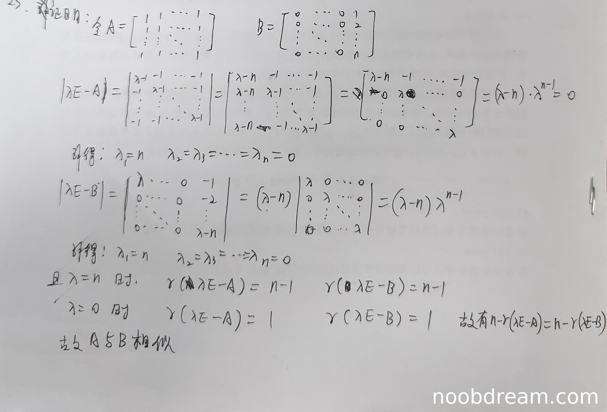 学生作答给出了两种识别结果,但核心内容一致。两种识别结果均正确计算了矩阵A和矩阵B的特征多项式,得到特征值均为n(单根)和0(n-1重根)。并且进一步计算了特征值对应的矩阵(λE-A)和(λE-B)的秩,得出对于每个特征值λ,有n - r(λE-A) = n - r(λE-B)。这等价于证明了两个矩阵的每个特征值的代数重数等于几何重数(即可对角化),并且特征值完全相同,因此两个矩阵都相似于同一个对角矩阵diag(n, 0, …, 0),从而A与B相似。