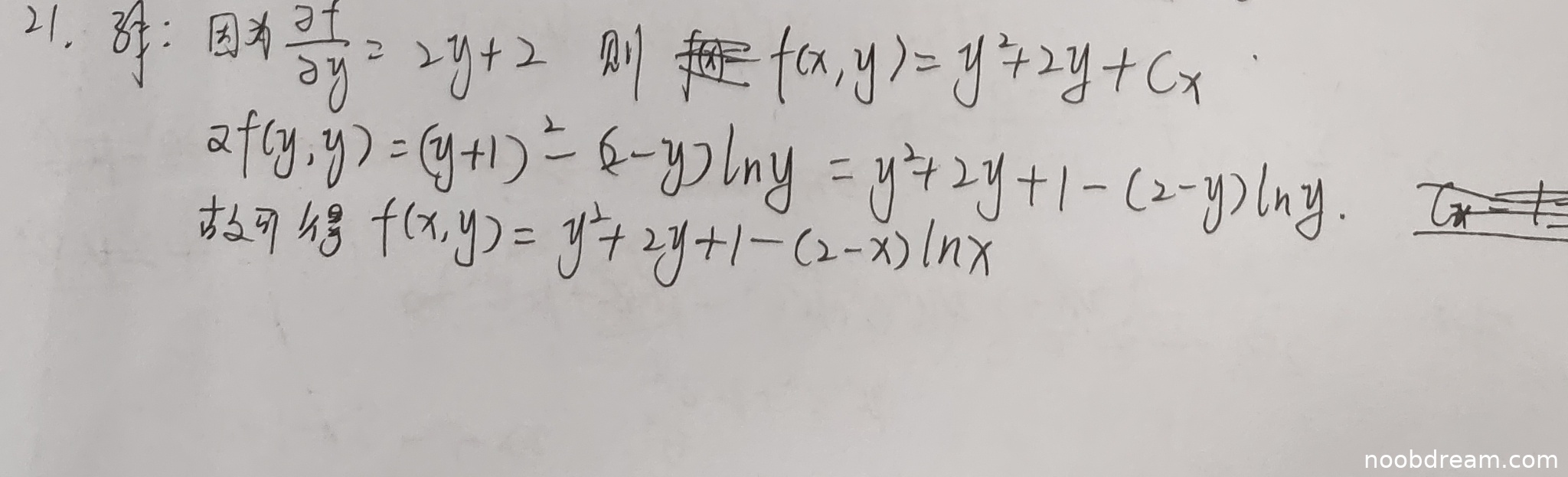 本题满分11分,学生作答给出了函数 \(f(x, y)\) 的求解过程,并得到了与标准答案一致的结果 \(f(x, y) = y^2 + 2y + 1 - (2-x)\ln x\)。具体分析如下: