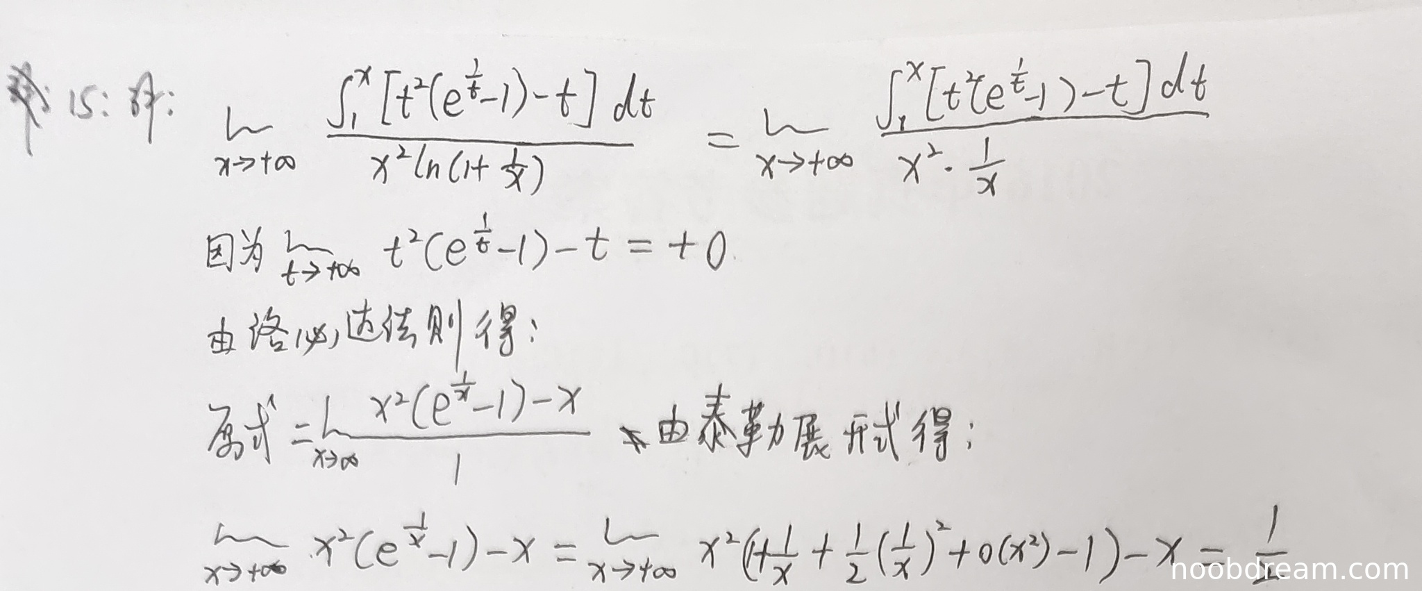 学生的解题过程与标准答案的核心逻辑完全一致,最终答案正确。虽然在第一次识别结果中,表述“因为\(\lim_{t \to +\infty} t^{2}(e^{\frac{1}{t}} - 1) - t = +0\)”的写法不够严谨(极限应为0,而非“+0”),且“由泰勒展开式得:”后面的表达式书写有笔误(如 \(o(x^2)\) 应为 \(o(\frac{1}{x^2})\)),但根据“禁止扣分”原则,这些属于识别误差或笔误,不影响核心逻辑,因此不扣分。