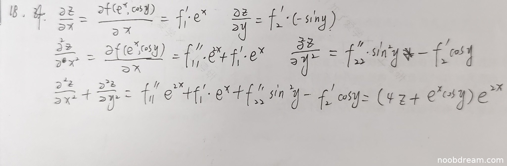 学生作答存在根本性错误。题目中函数为 \( z = f(e^x \cos y) \),即 \( f \) 是单变量函数,其自变量为 \( e^x \cos y \)。但学生在两次识别中均将函数误写为 \( z = f(e^x, \cos y) \),即理解为 \( f \) 是二元函数。基于此错误理解,后续求偏导时使用了二元函数的偏导符号(如 \( f_1', f_2', f_{11}'', f_{22}'' \)),并得到了一个与题目条件不符的复杂表达式,最终未能推导出关于 \( f(u) \) 的常微分方程 \( f''(u) - 4f(u) = u \)。