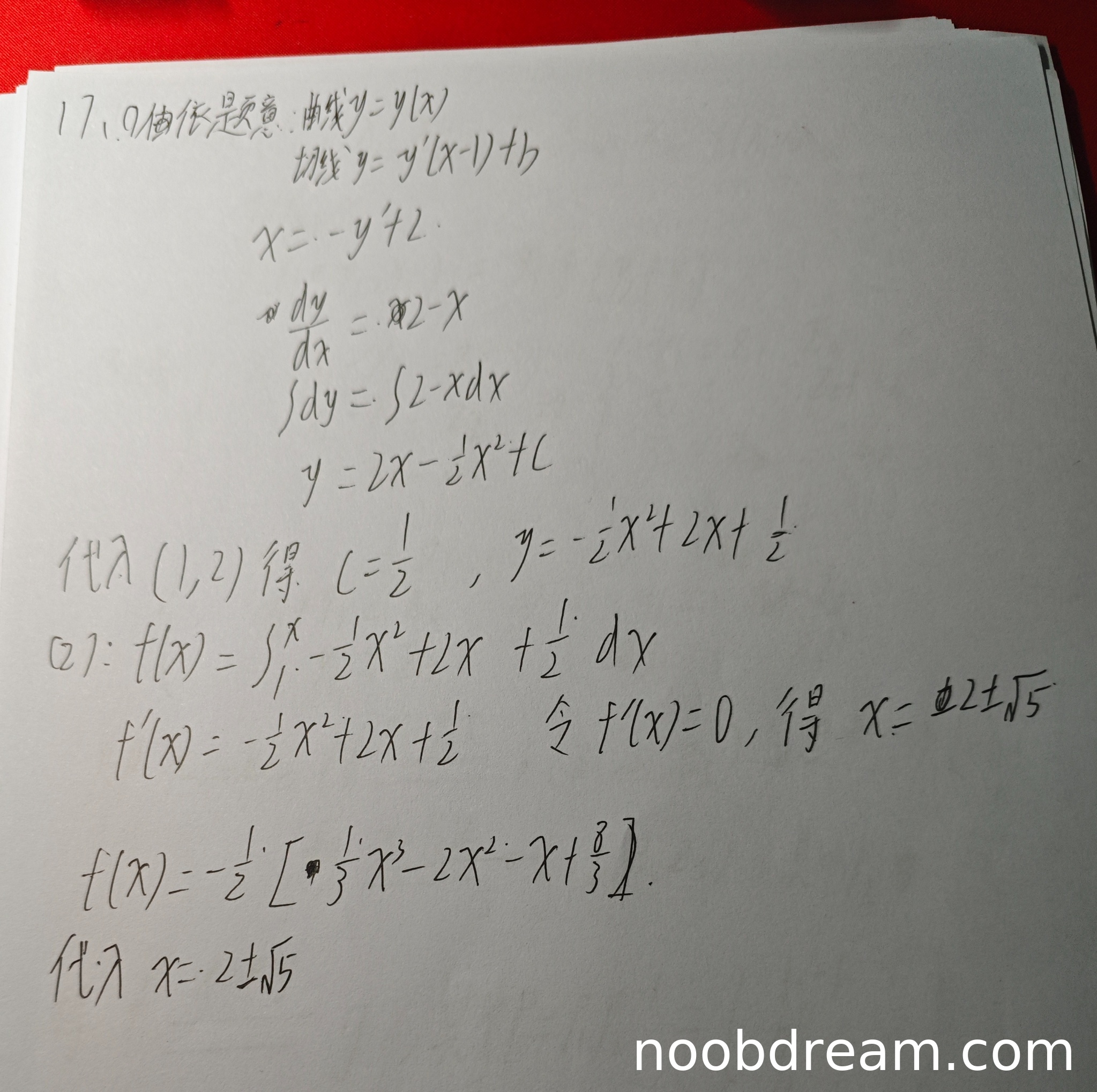 第(2)问要求求 \( f(x) = \int_1^x y(t) dt \) 的最大值。由于学生在(1)中得到的 \( y(x) \) 错误,因此 \( f(x) \) 表达式错误,后续求导、求驻点等步骤虽然计算过程在形式上正确,但基于错误函数,无法得到正确结果。尽管学生展示了求定积分、求导、令导数为零解方程等正确思路,但核心函数错误导致整体解答无效。根据评分原则,逻辑错误需扣分,且(2)问依赖于(1)问的正确结果,因此(2)问也不得分。