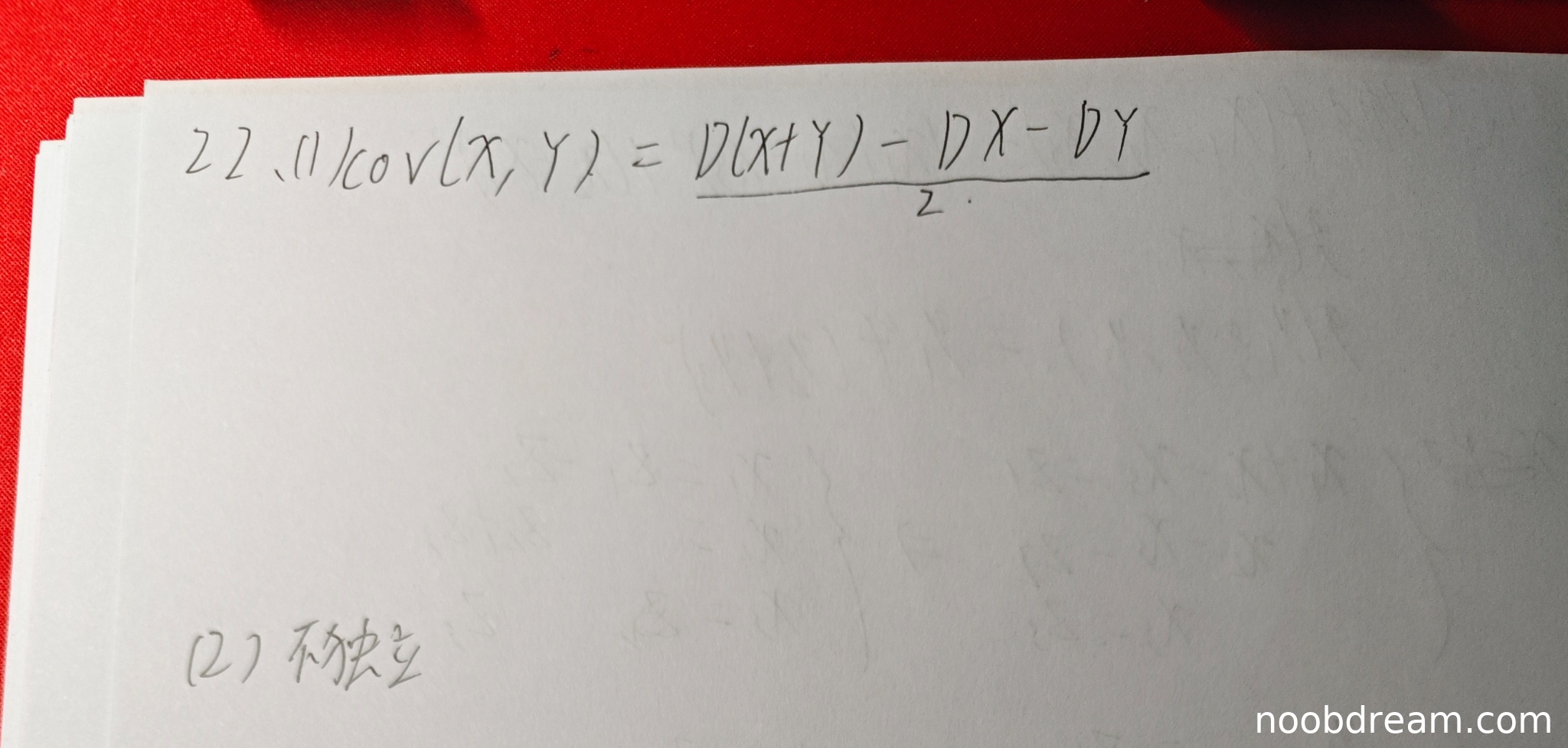 学生给出了协方差的一个正确公式 \( \text{Cov}(X,Y) = \frac{D(X+Y)-DX-DY}{2} \),但未进行任何计算,也未得出最终结果 \( \text{Cov}(X,Y)=0 \)。该公式本身正确,但题目要求计算协方差的具体数值,学生仅列出公式而未代入计算,属于解答不完整。因此扣去大部分分数,仅给予公式正确的部分分数。得1分。